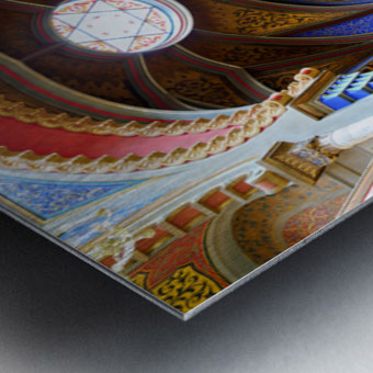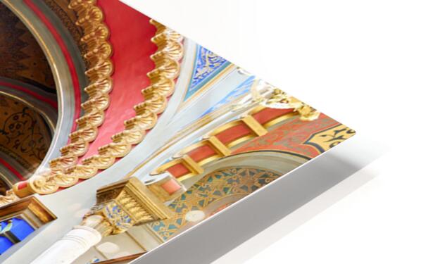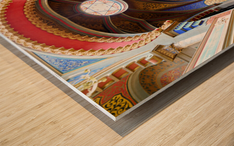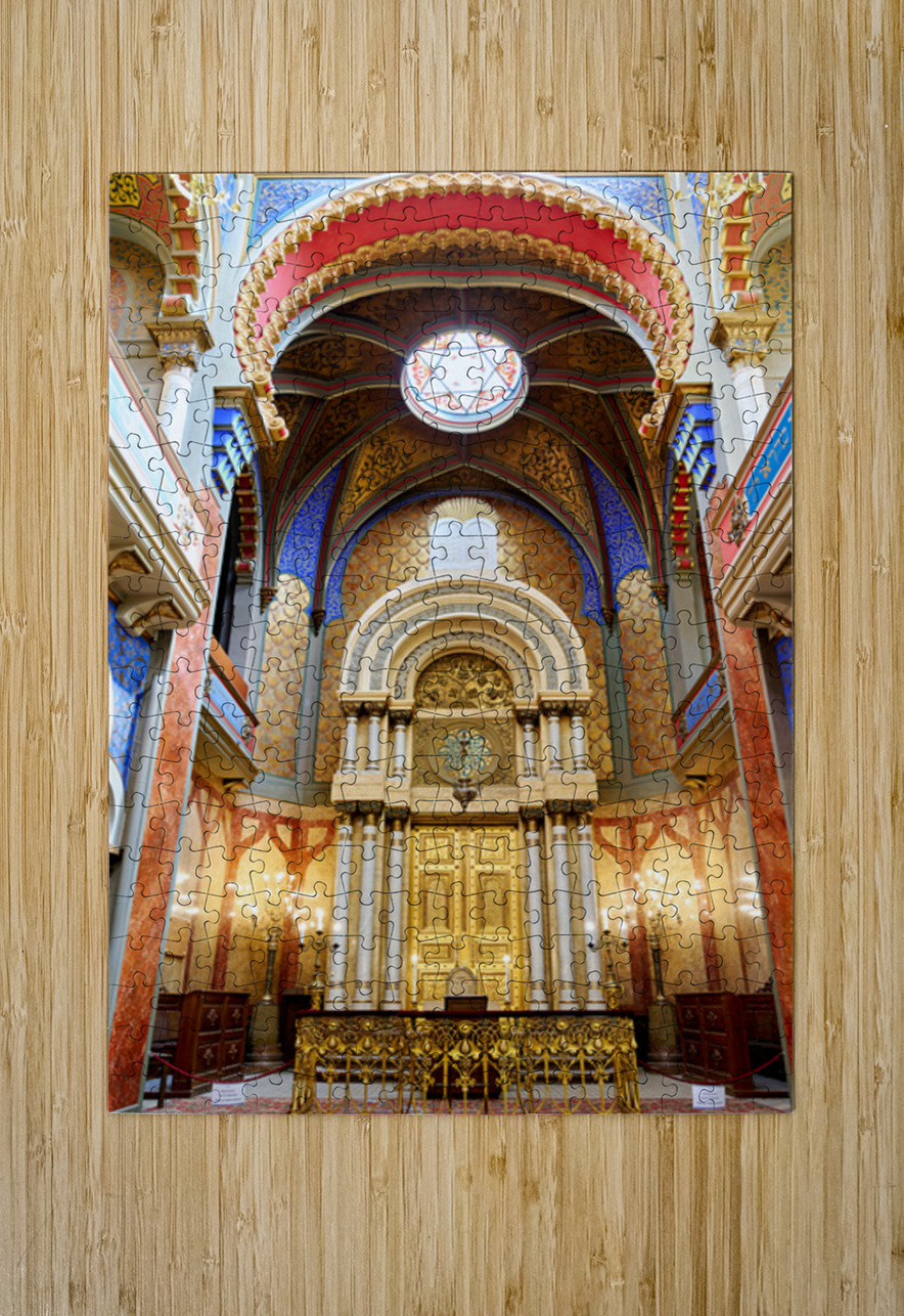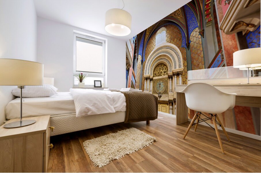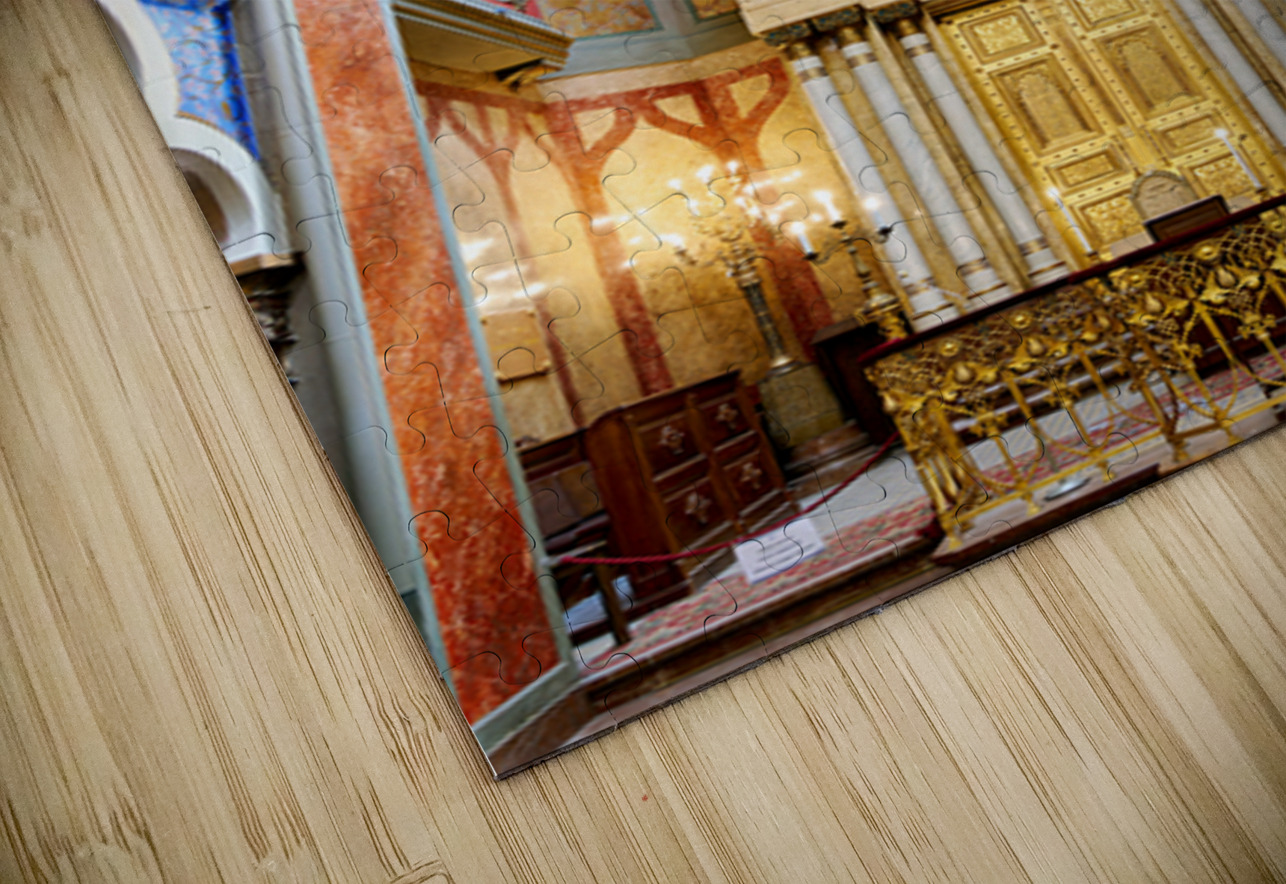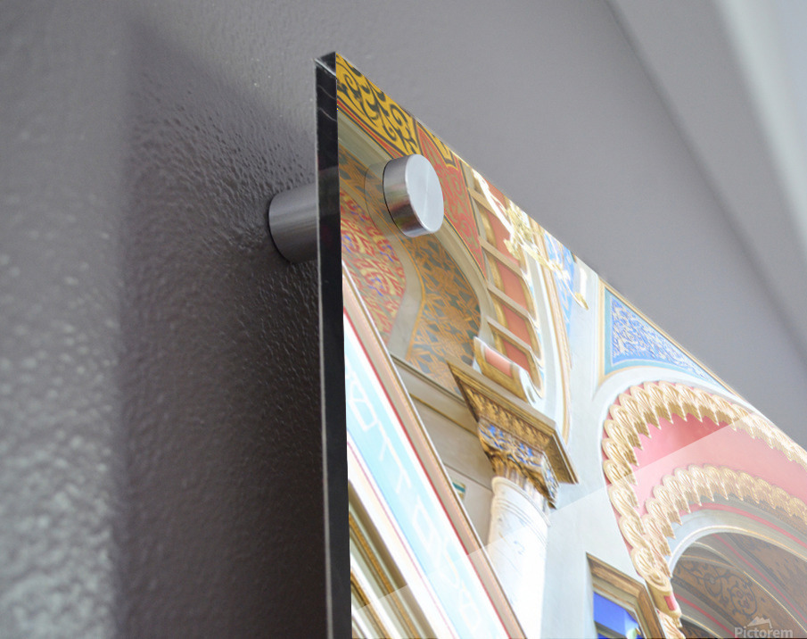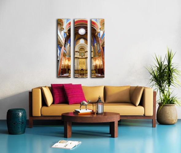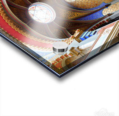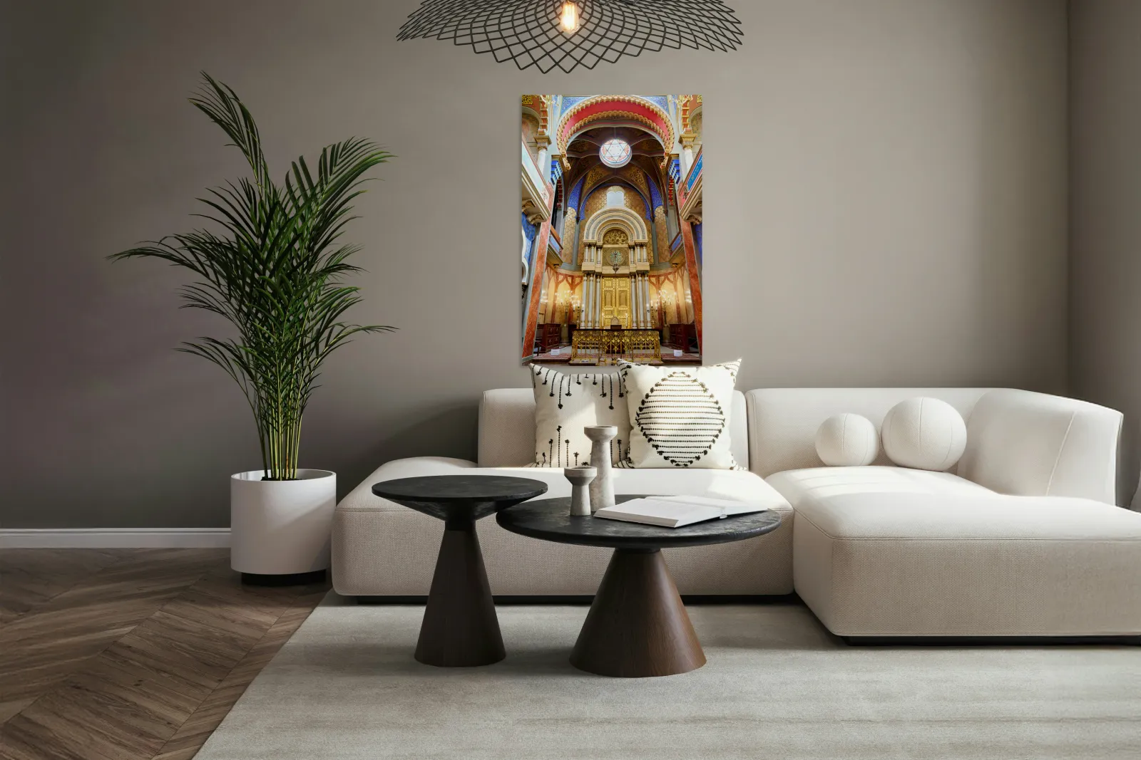 "Ornate synagogue interior with golden ark and colorful decoratio" in a framed print.