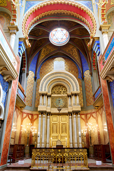 Inside Pragues Spanish Synagogue Czech Republic revealing its breathtaking Moorish revival architecture gilded Holy Ark and stained-glass Star of Davi