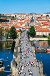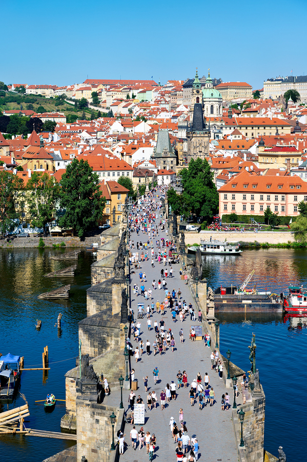 Tourists and locals stroll across the historic Charles Bridge in Prague Czech Republic enjoying the sunny day and views of the Vltava River and city.
