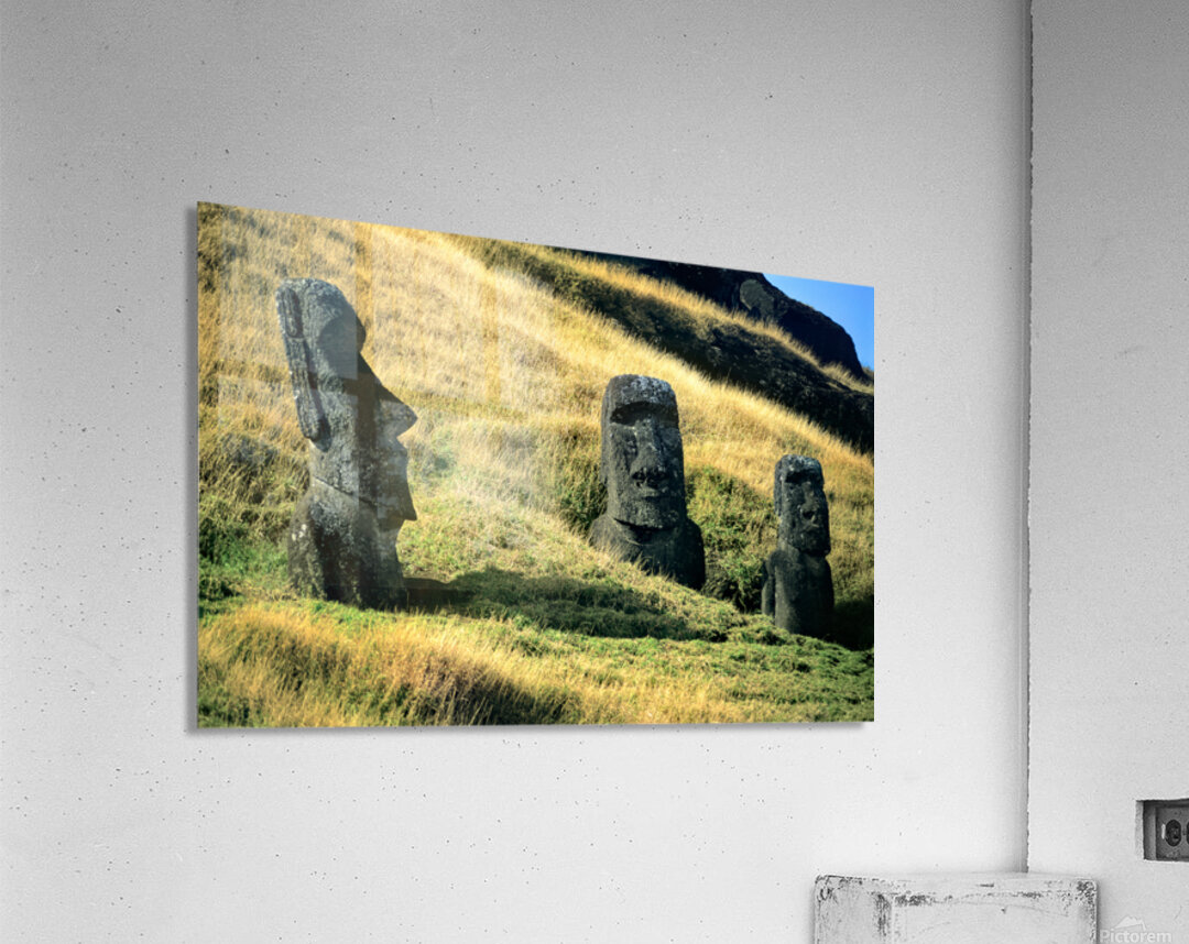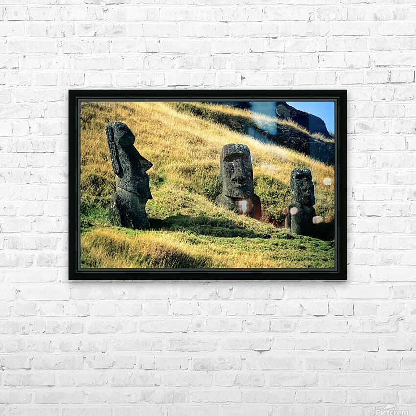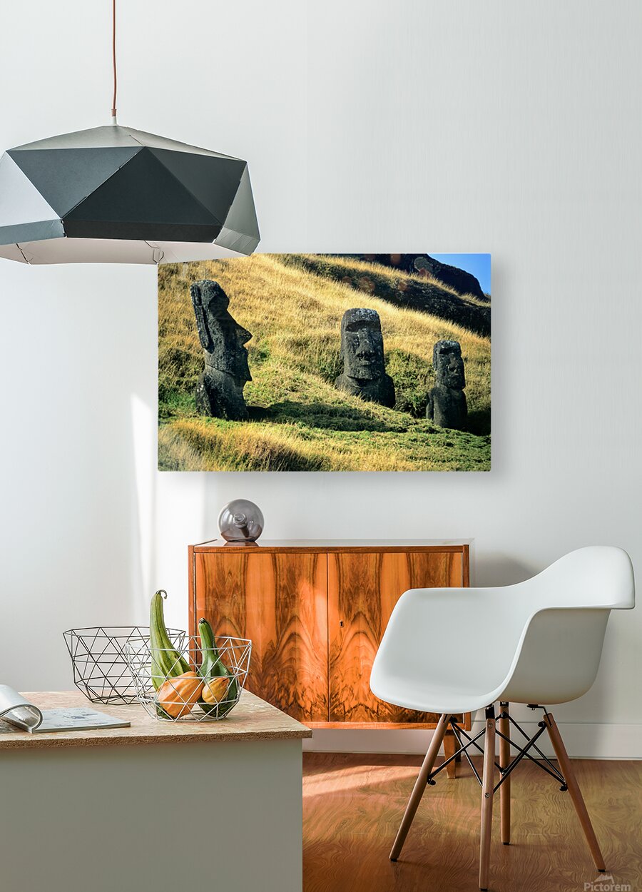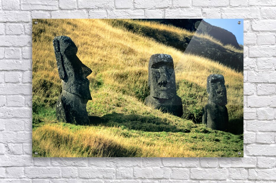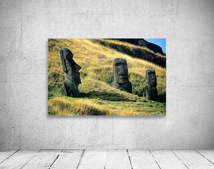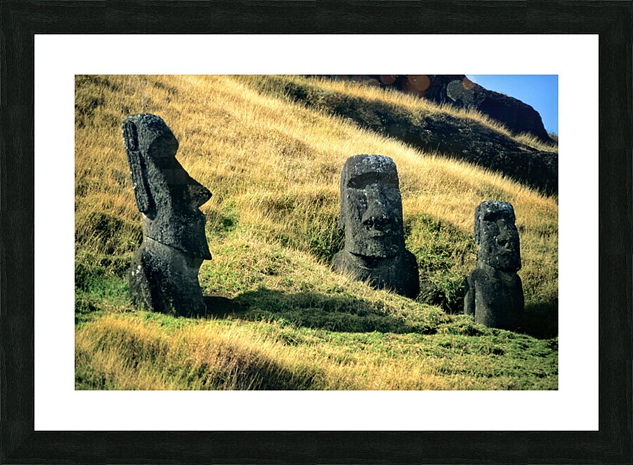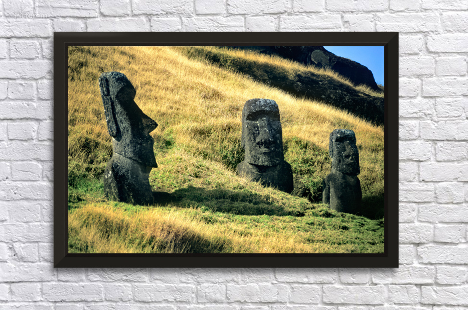 "Three Moai statues on a grassy hillside." in a framed print.