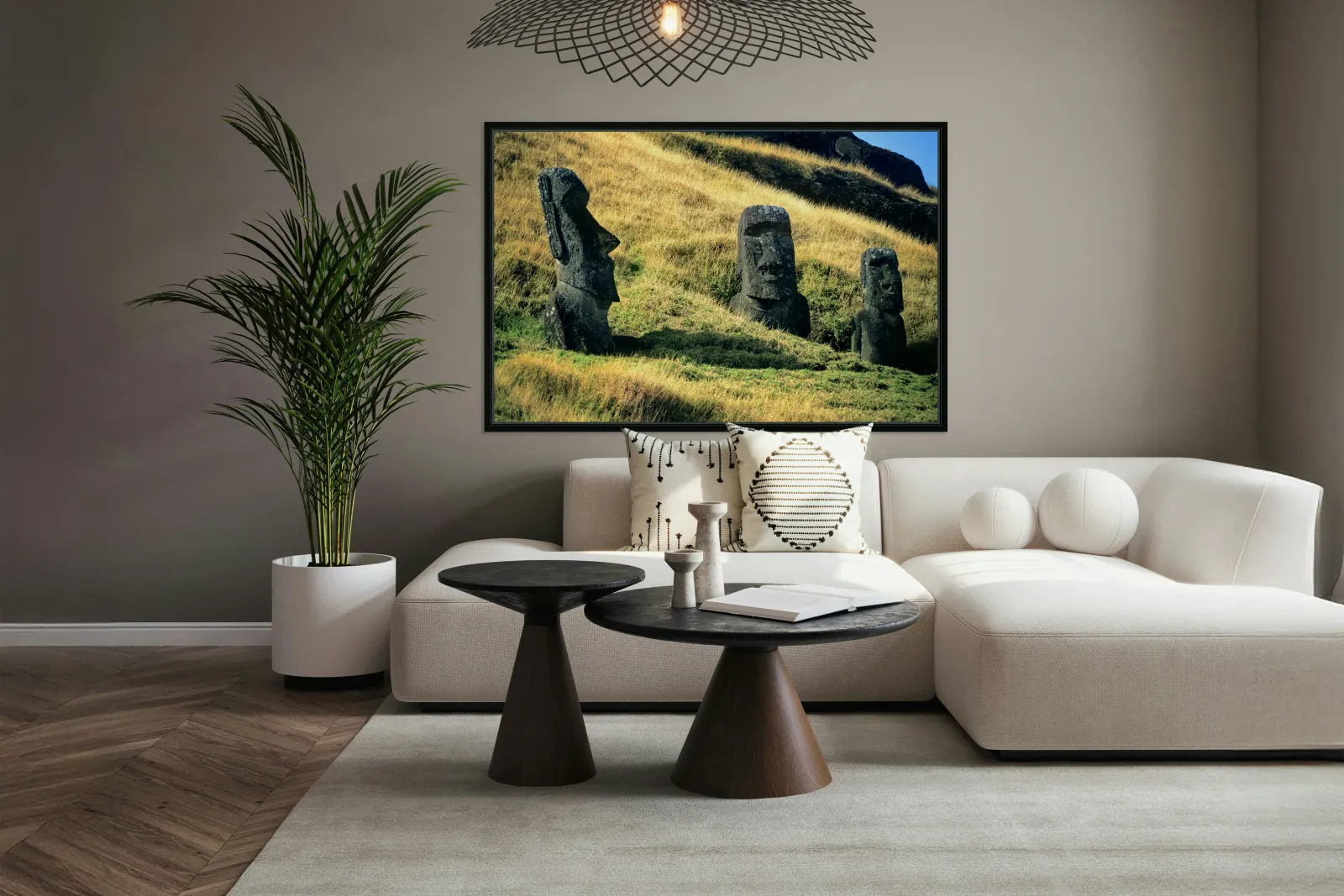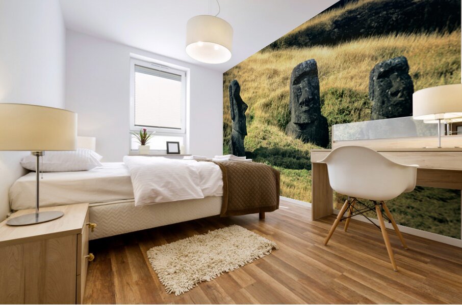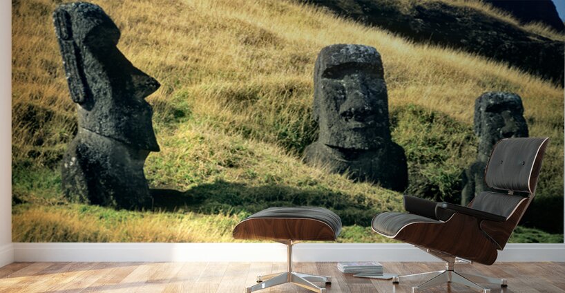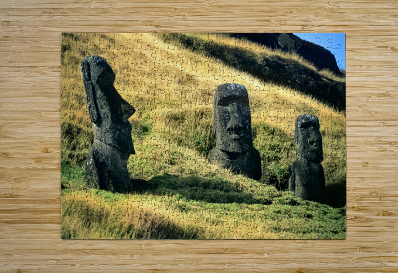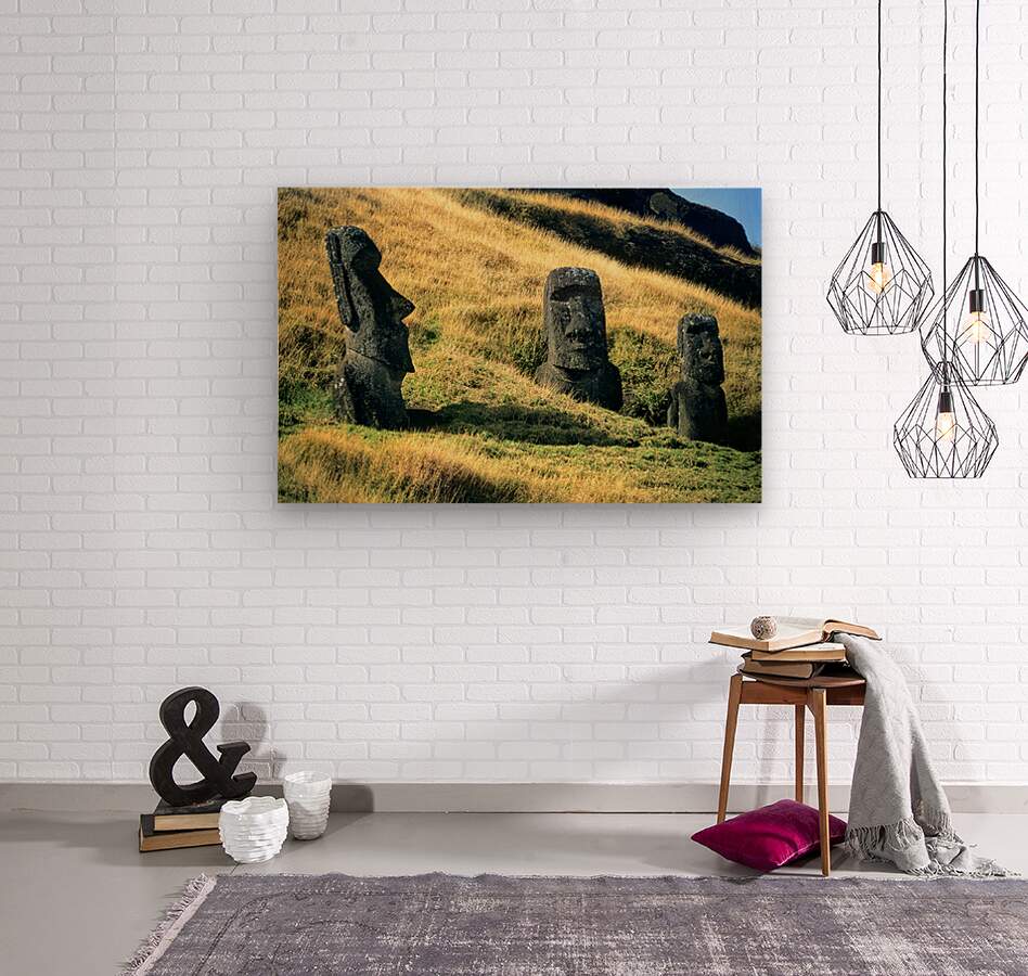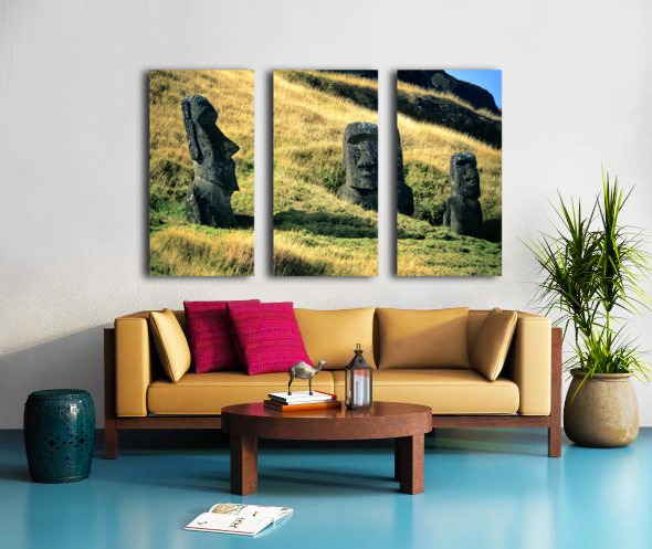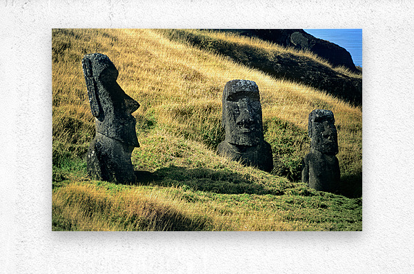 "Three Moai statues on a grassy hillside." in a framed print.