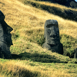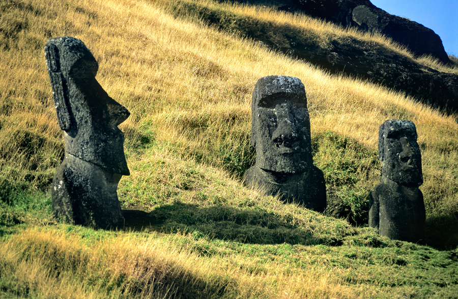 Ancient Moai statues carved by the Rapa Nui people stand on Easter Island Chile representing deified ancestors.