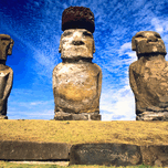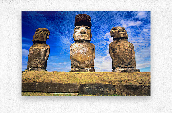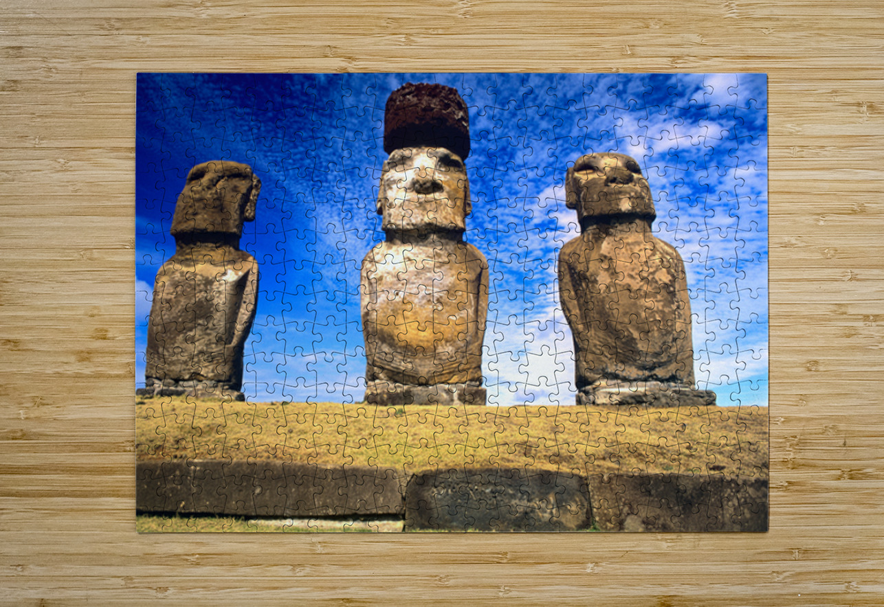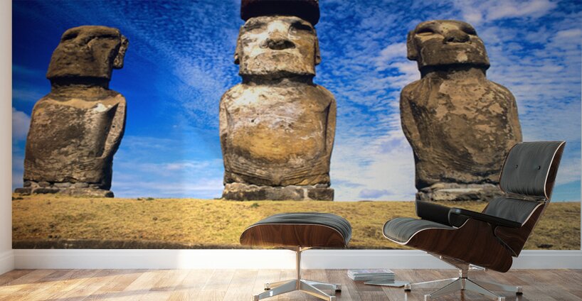 Three ancient Moai statues stand on Easter Island Chile carved by the Rapa Nui people to honor ancestors.