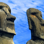 Two ancient Moai statues carved by the Rapa Nui people stand on Easter Island Chile honoring deified ancestors under a blue sky.