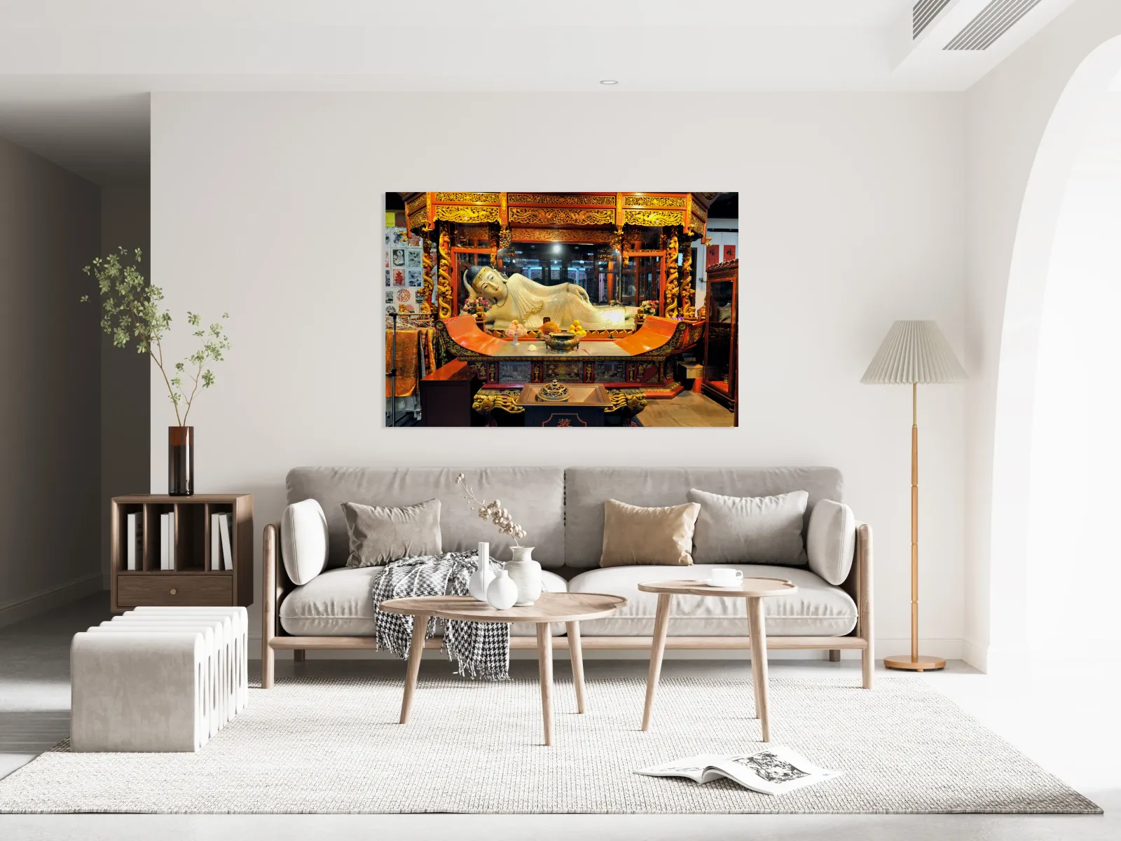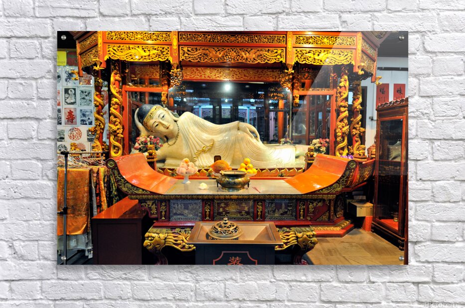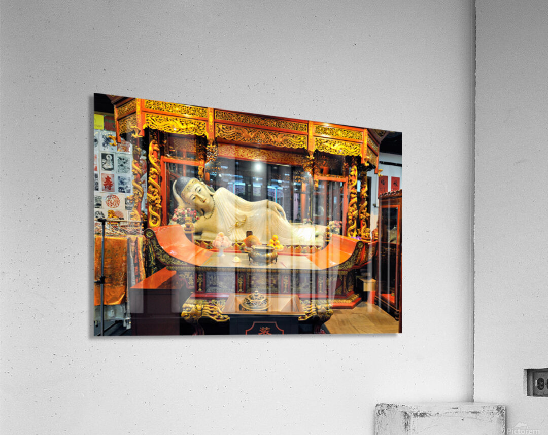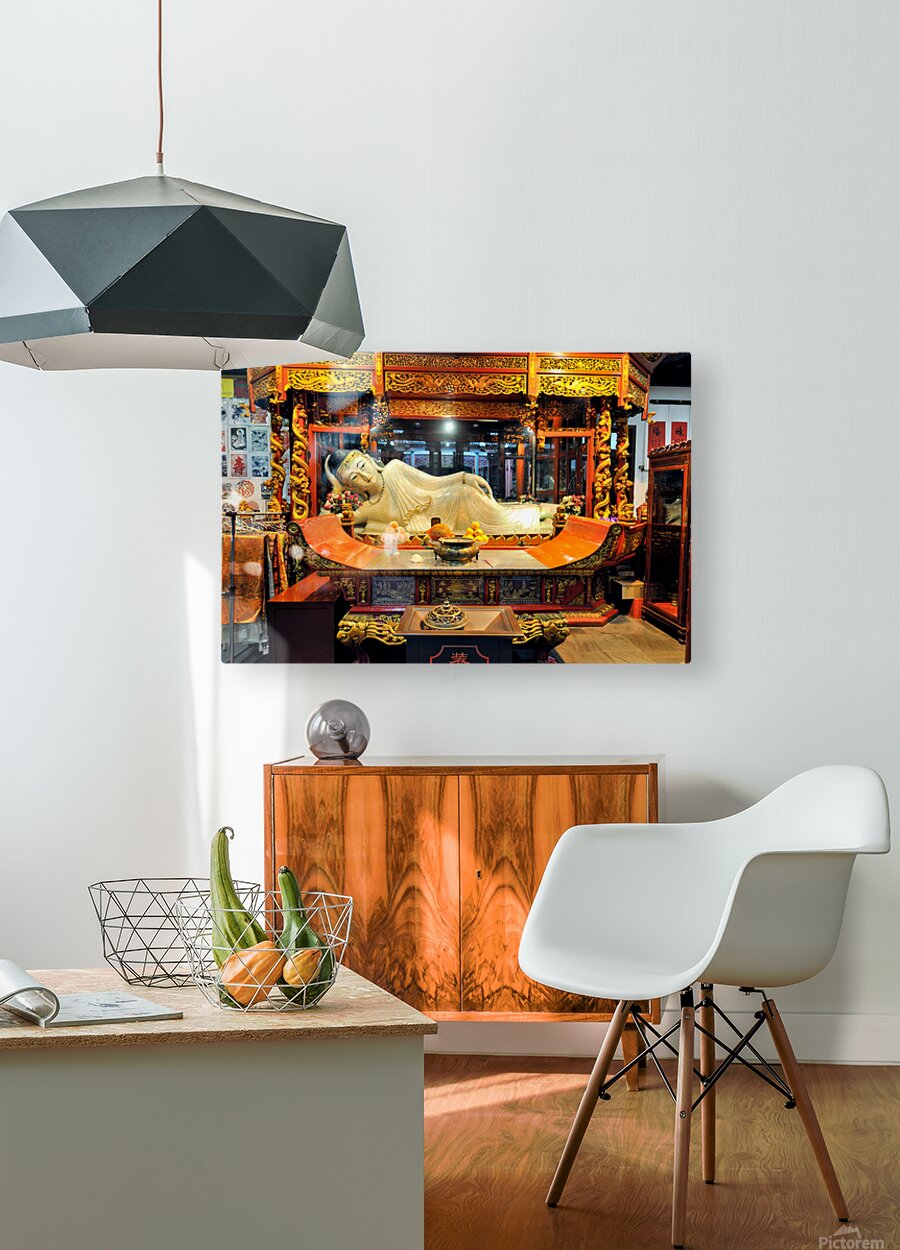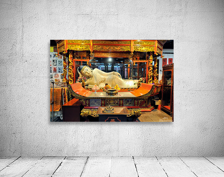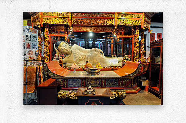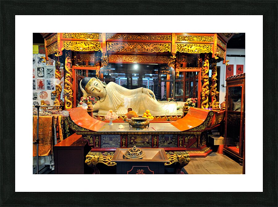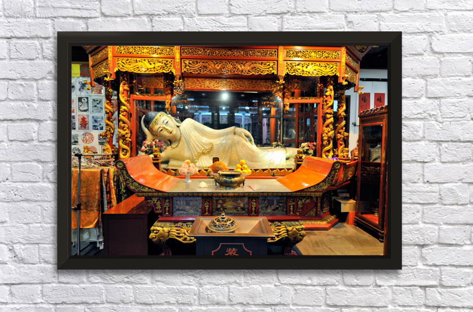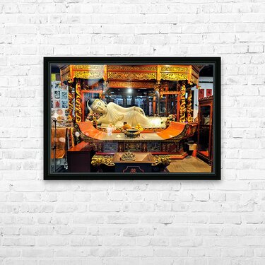 "Reclining Buddha statue in temple in Shanghai China" in a framed print.