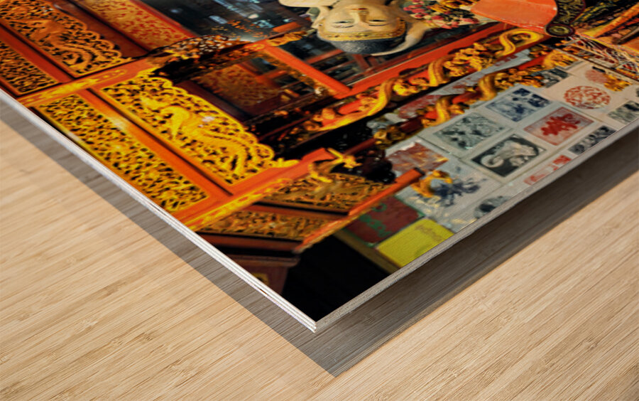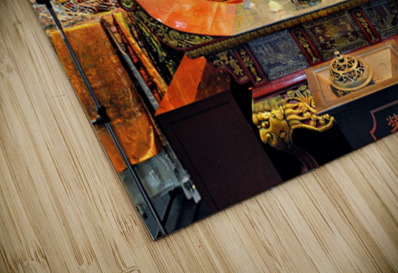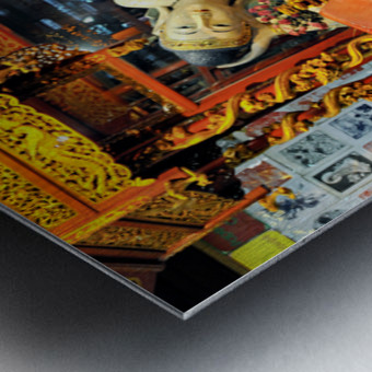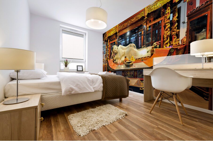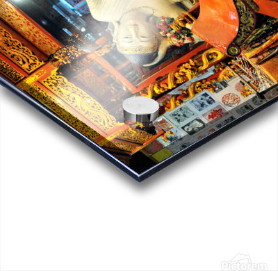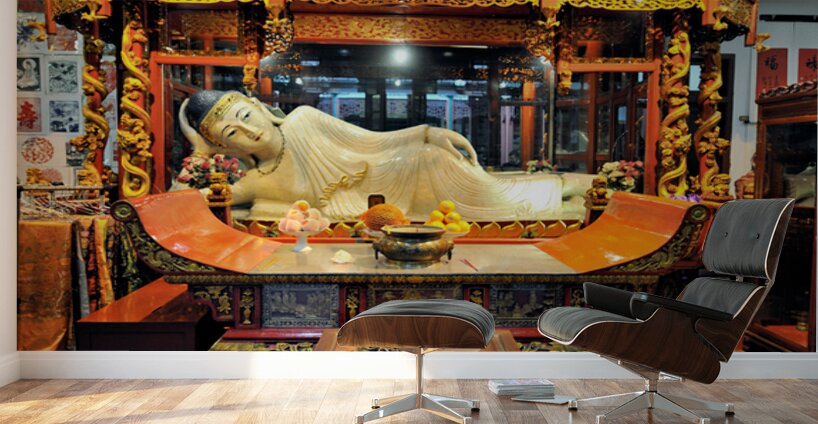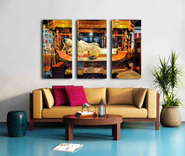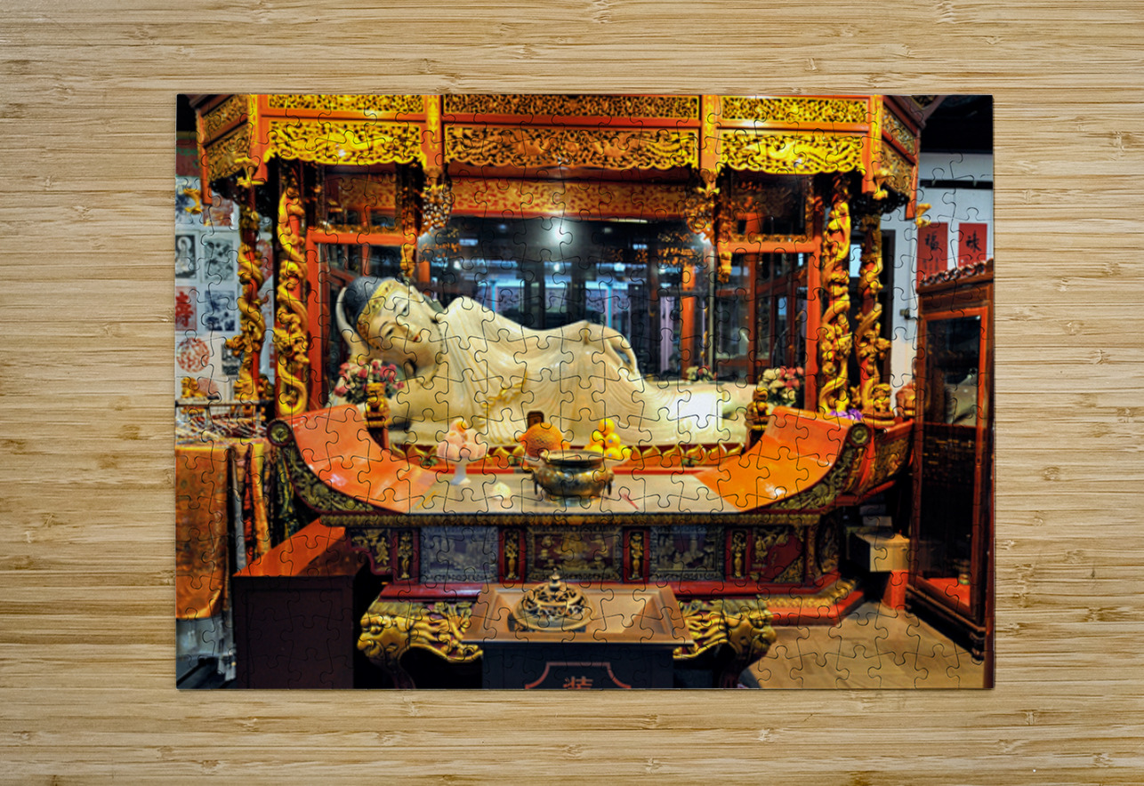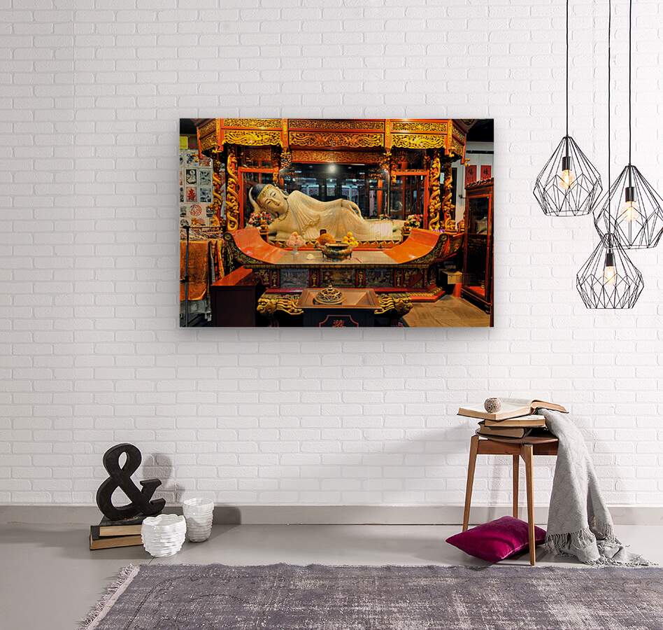 "Reclining Buddha statue in temple in Shanghai China" in a framed print.