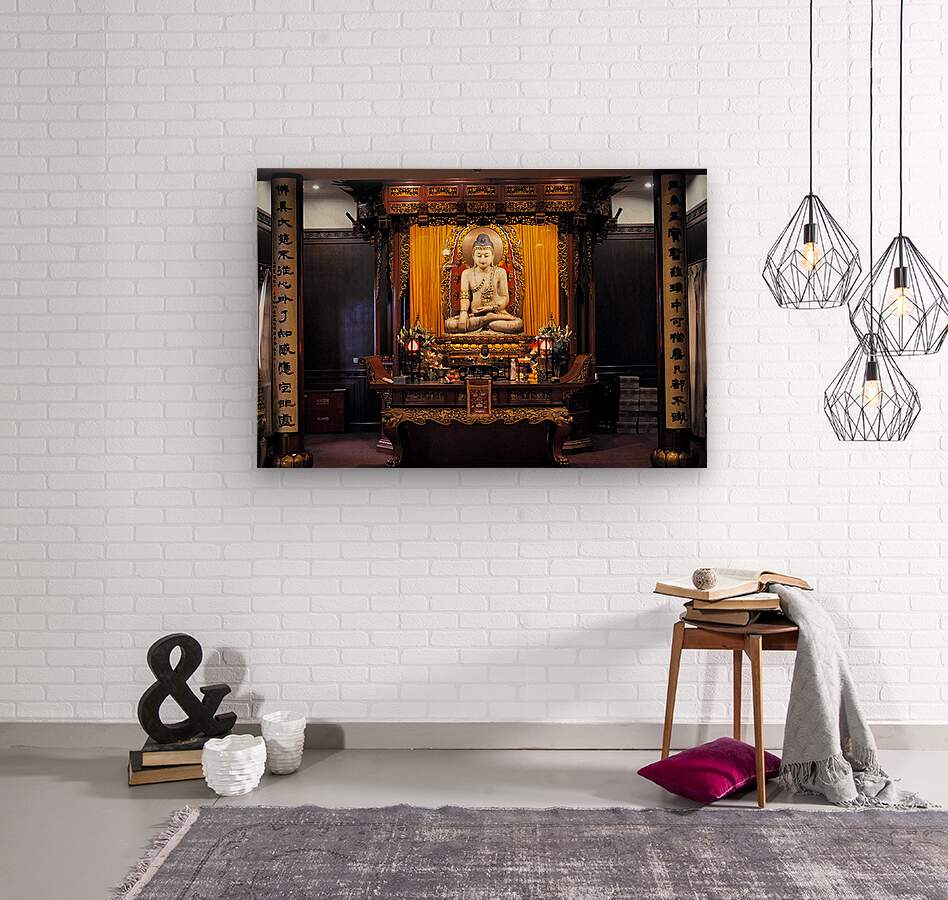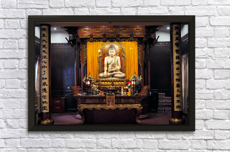 "Buddha statue in ornate temple in Shanghai China" in a framed print.