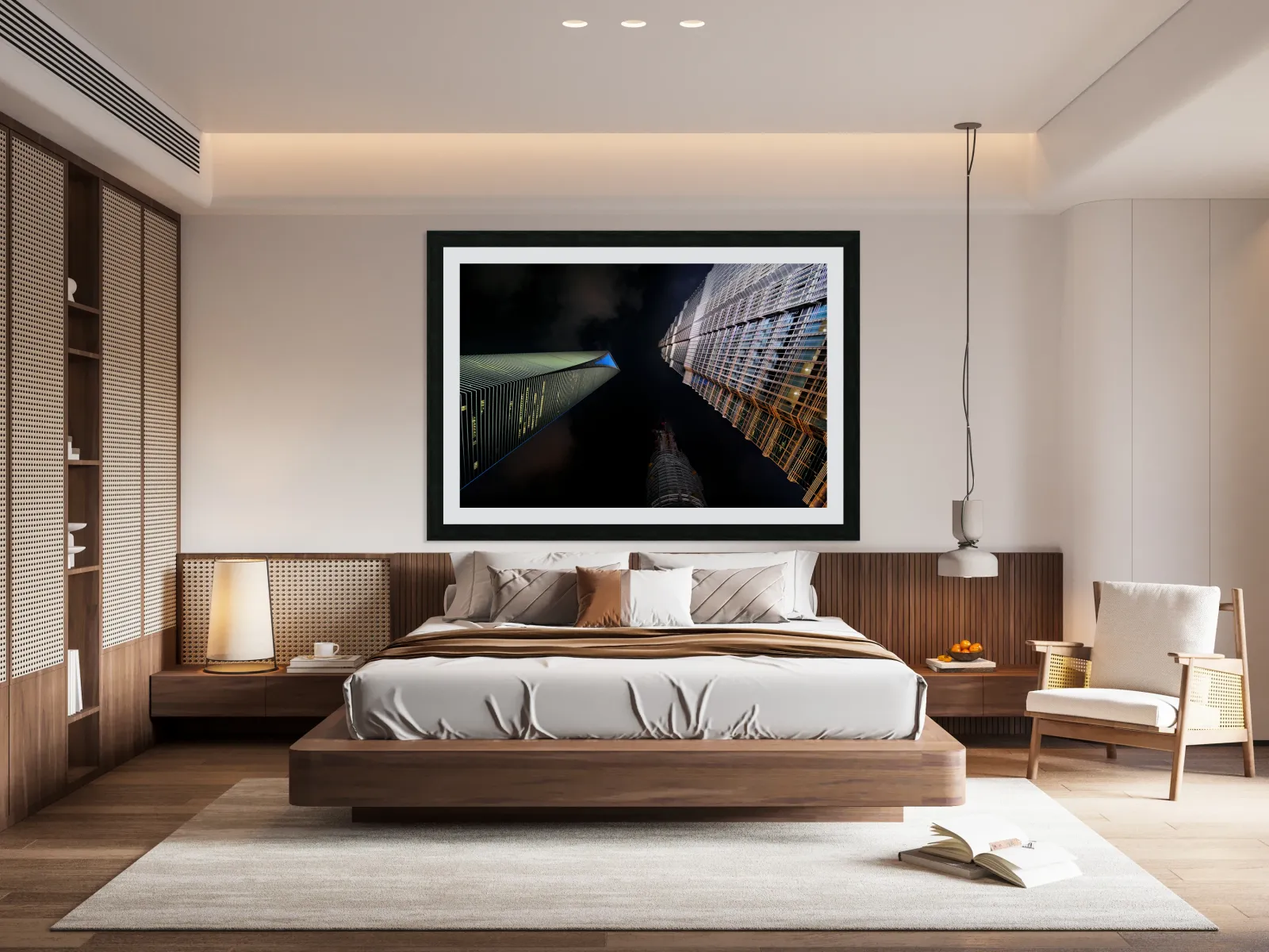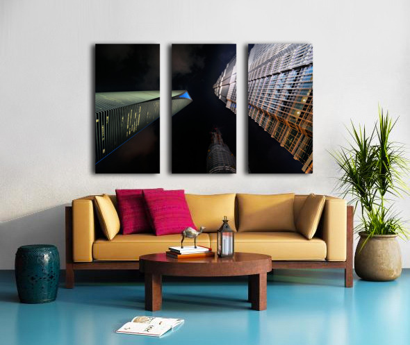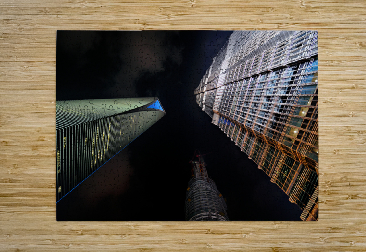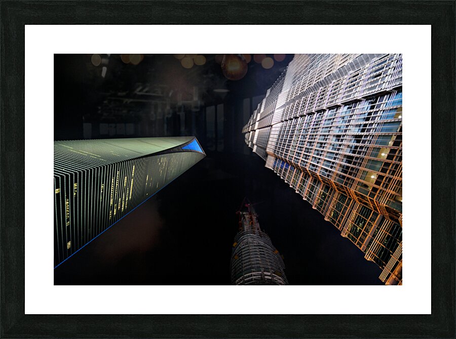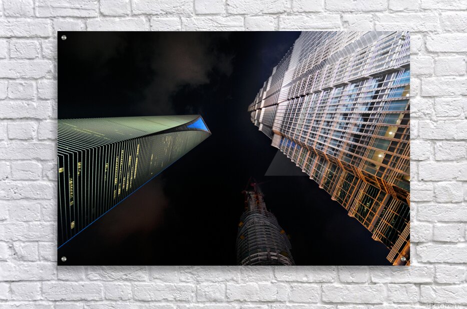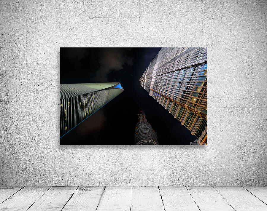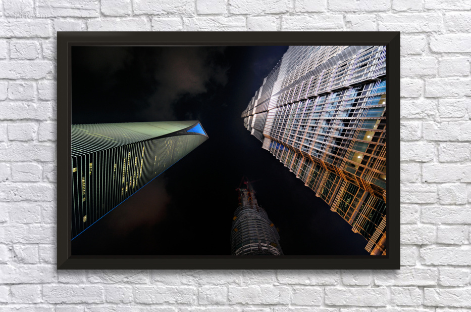 "Illuminated skyscrapers of Shanghai light up the night sky" in a framed print.