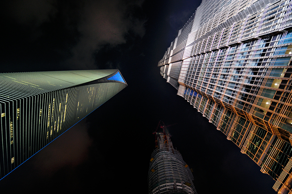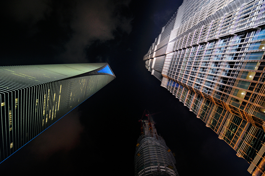 Skyscrapers in Shanghai shine brightly at night showcasing the citys modern architecture. The buildings reach high into the dark sky.