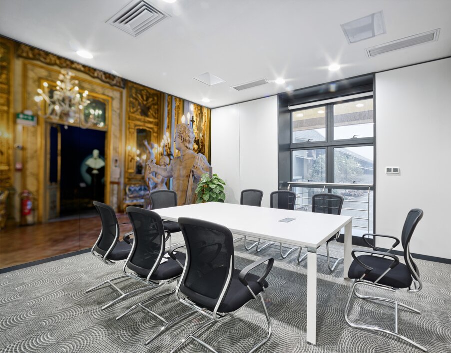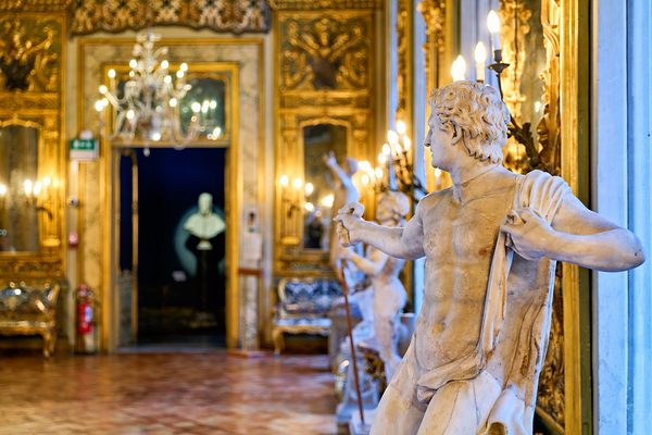 Visitors walk through the Doria Pamphilj Gallery observing art and statues. The grand room features elegant decor and shining lights.