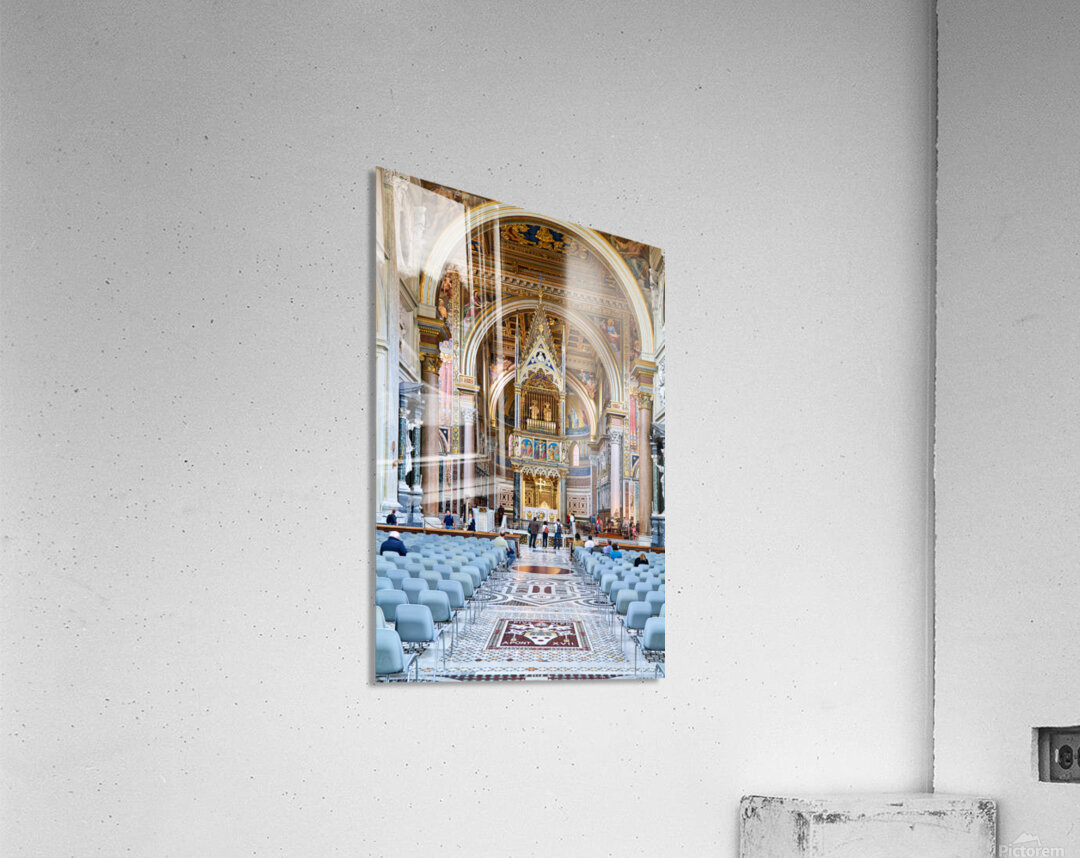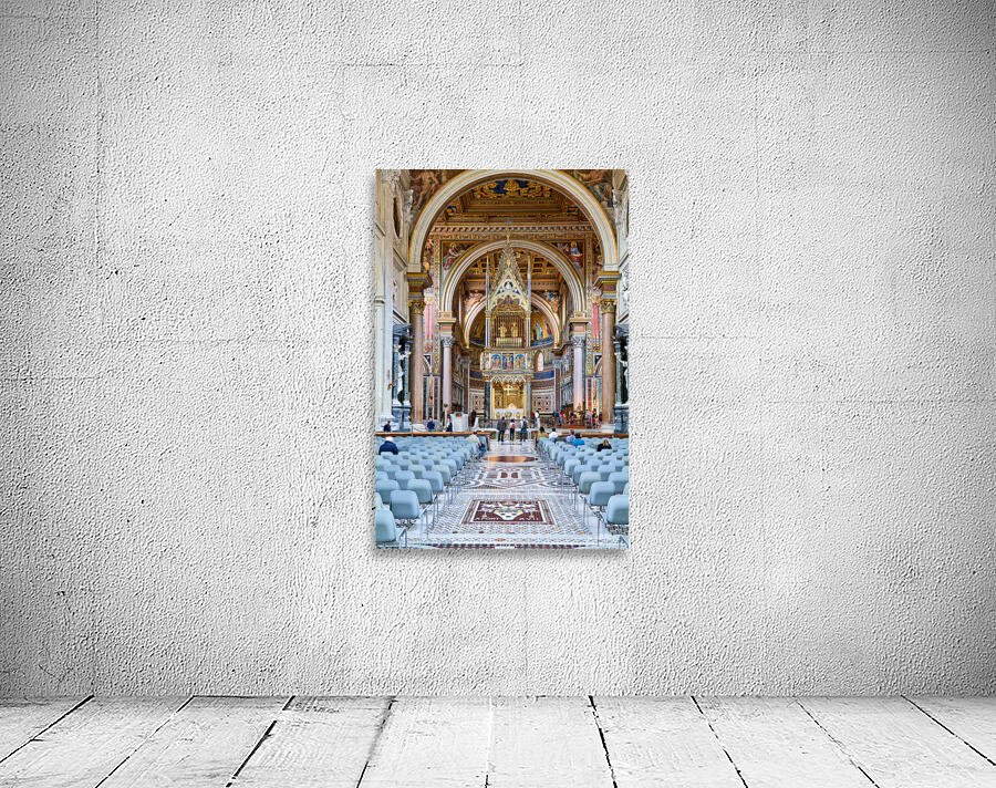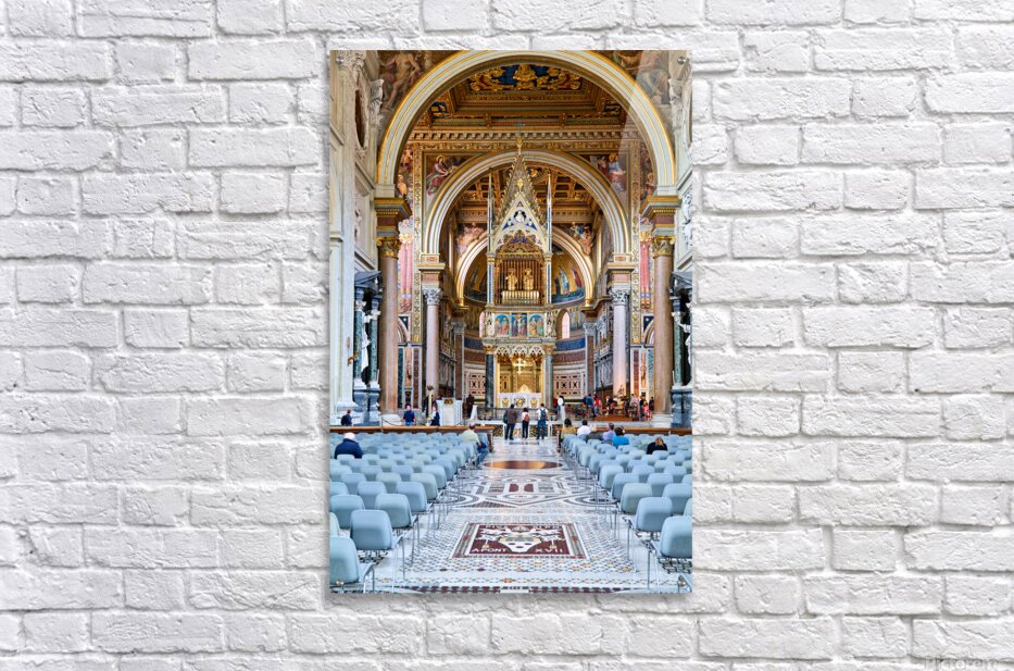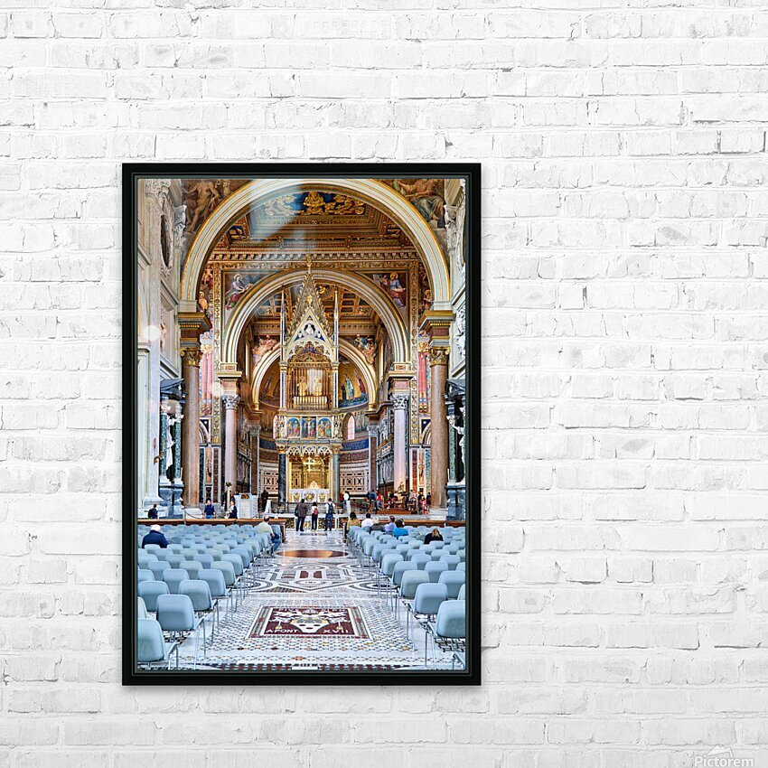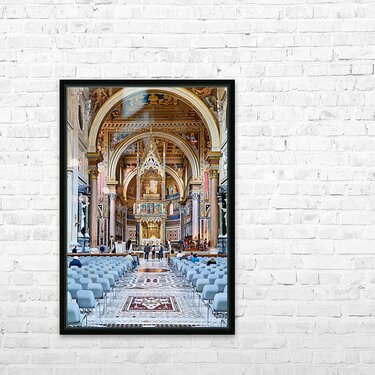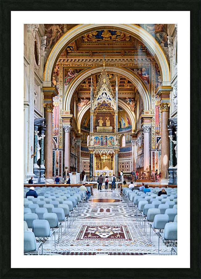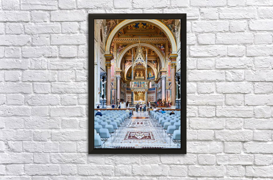 "Visitors explore the Archbasilica Cathedral in Rome Italy" in a framed print.