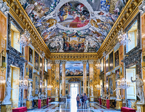 Visitors are enjoying their time in the Great Hall of Colonna Art Gallery in Palazzo Colonna Rome. The hall is filled with art and high ceilings.