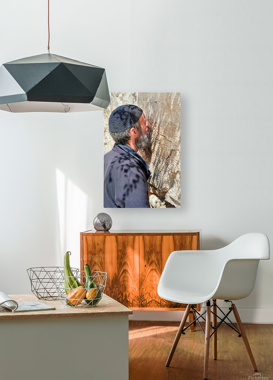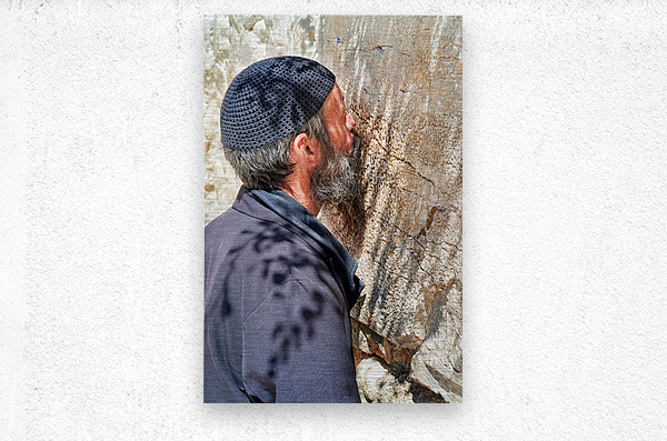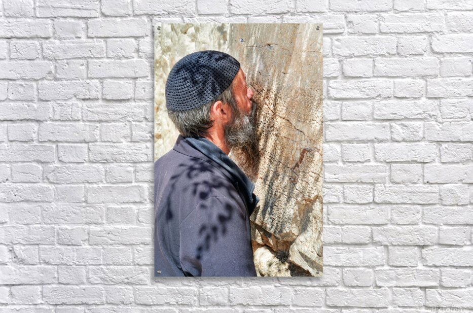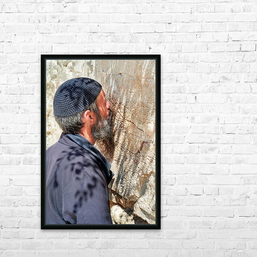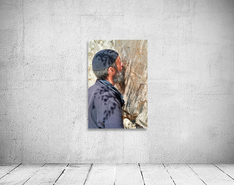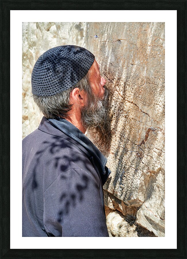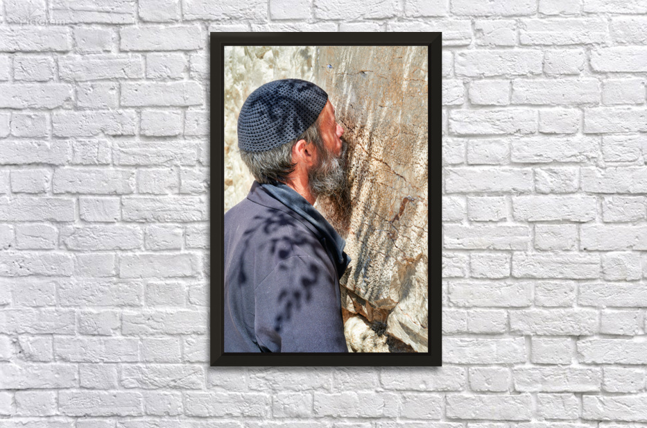 "Prayers at the wailing wall in jerusalem by orthodox jews" in a framed print.