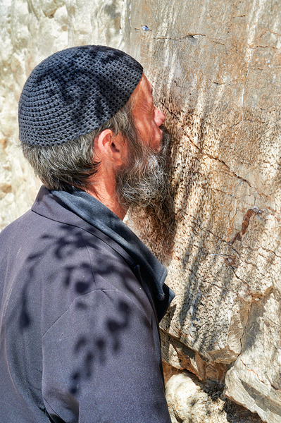 Orthodox Jews pray at the western wall in Jerusalem. They place their faces close to the ancient stones.