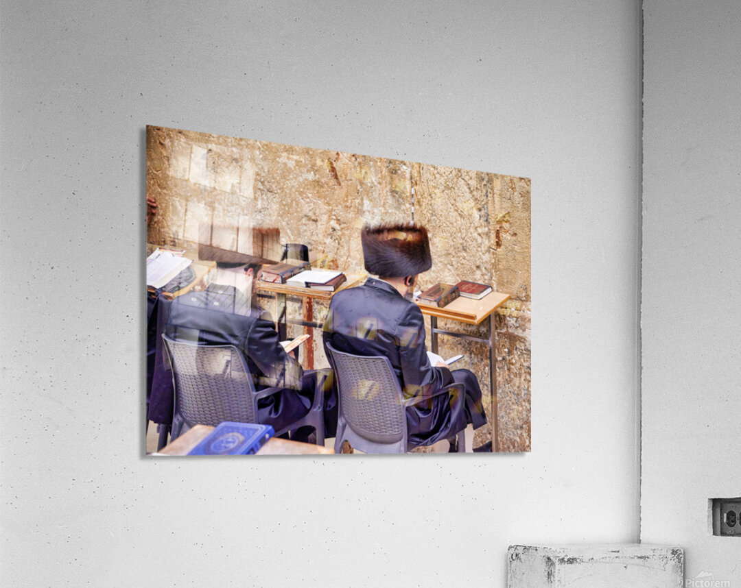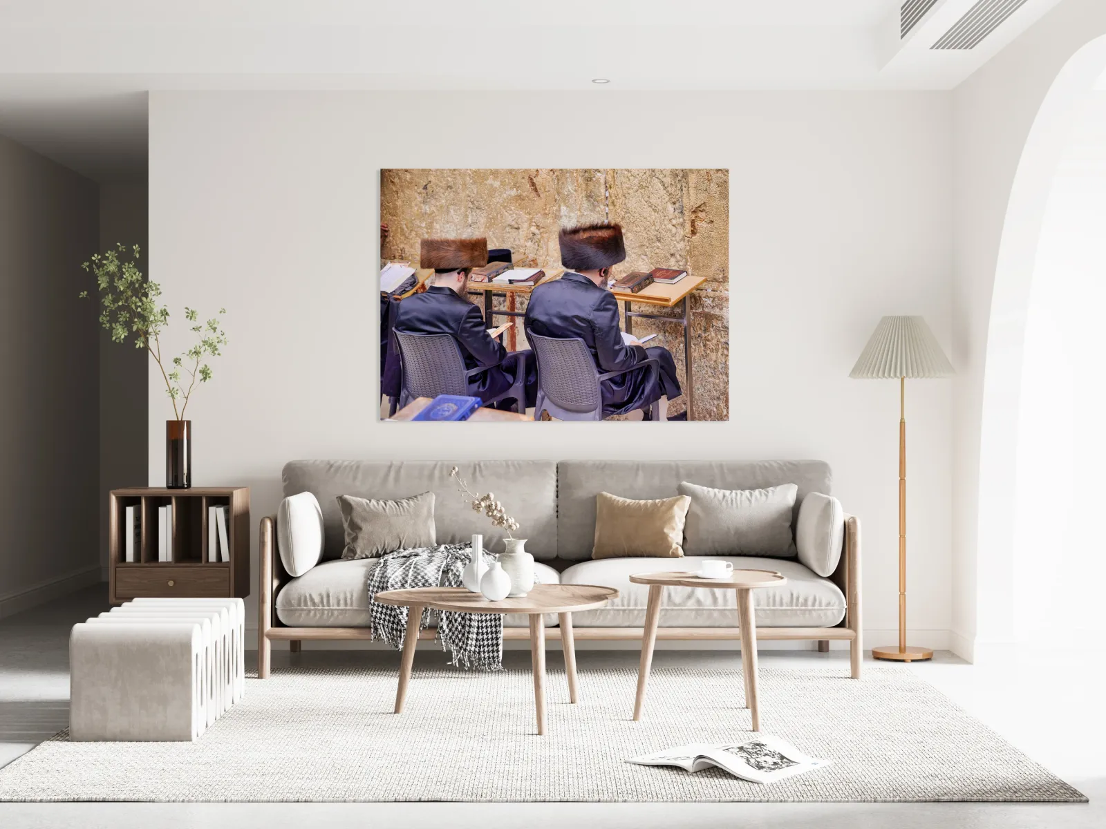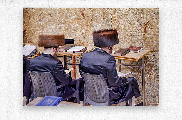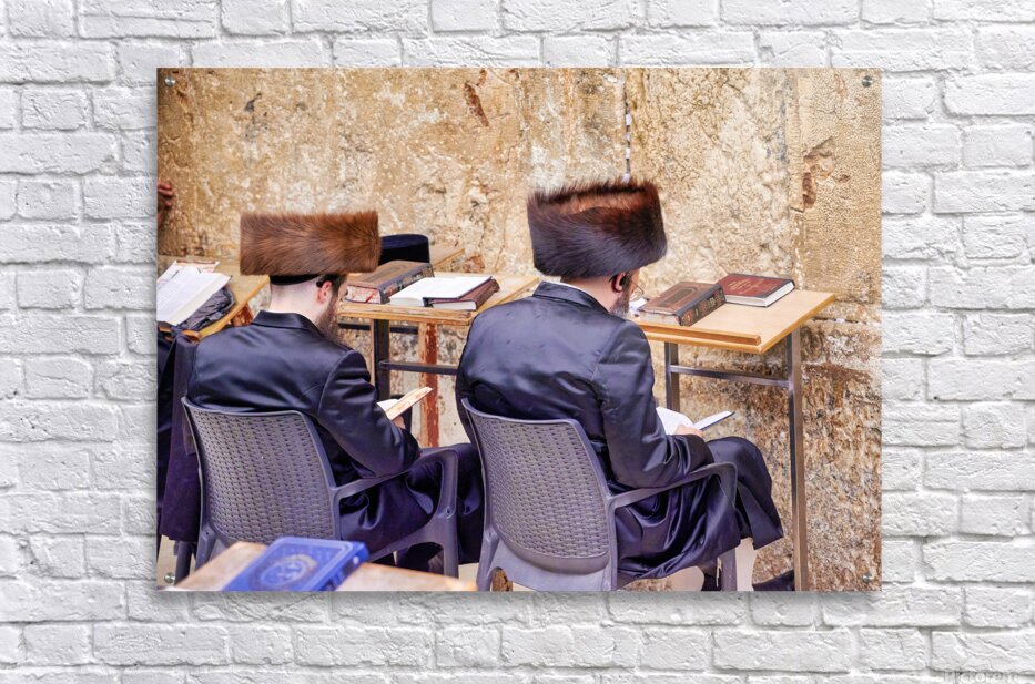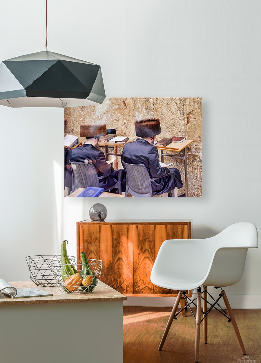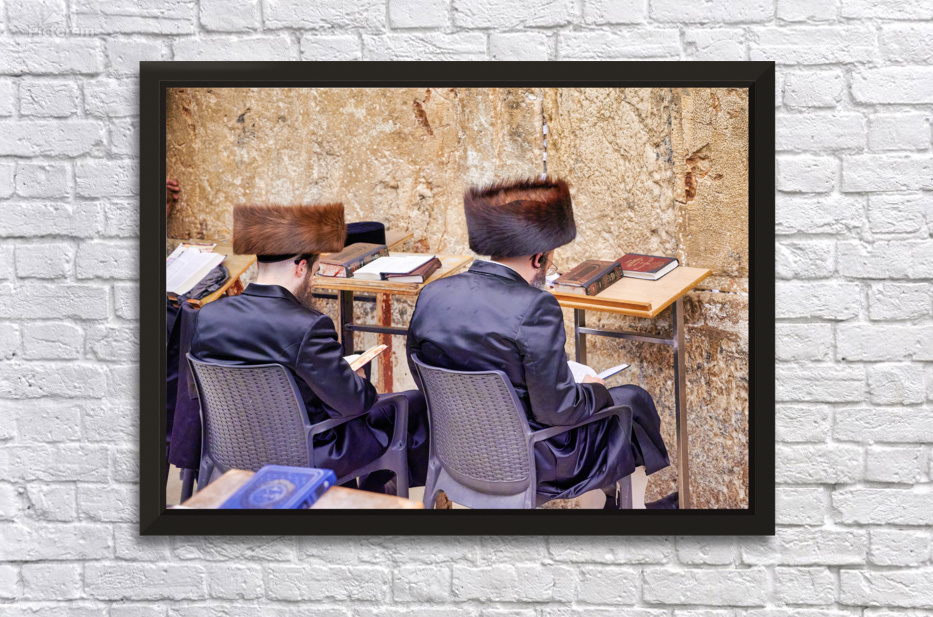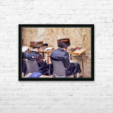 "Orthodox Jews sit at tables by the Western Wall in Jerusalem" in a framed print.