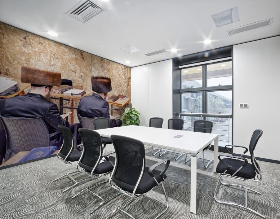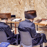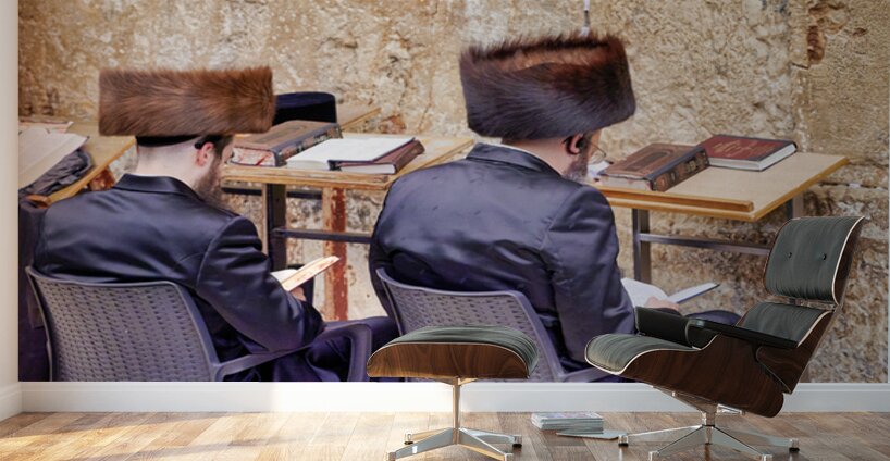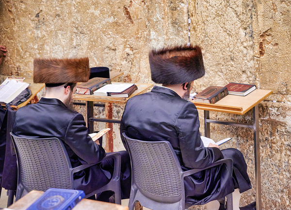 Orthodox Jews sit at tables by the Western Wall in Jerusalem. They are praying and reading religious texts during prayer time.