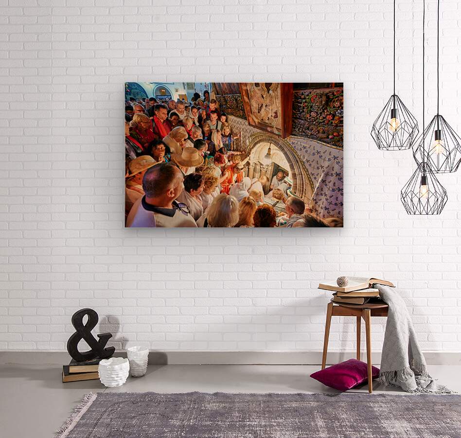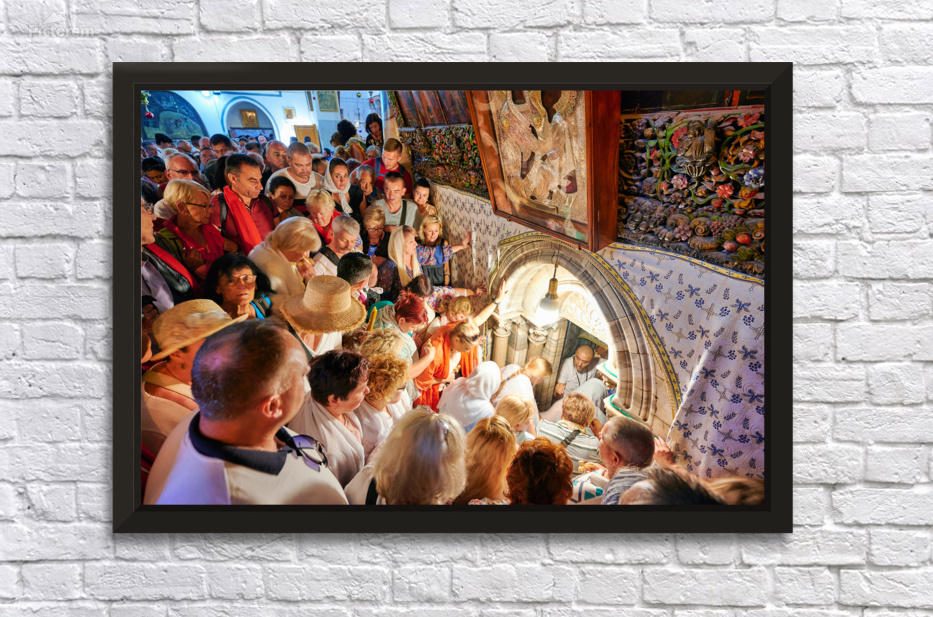 "Crowd gathers at grotto of nativity in Bethlehem Israel" in a framed print.