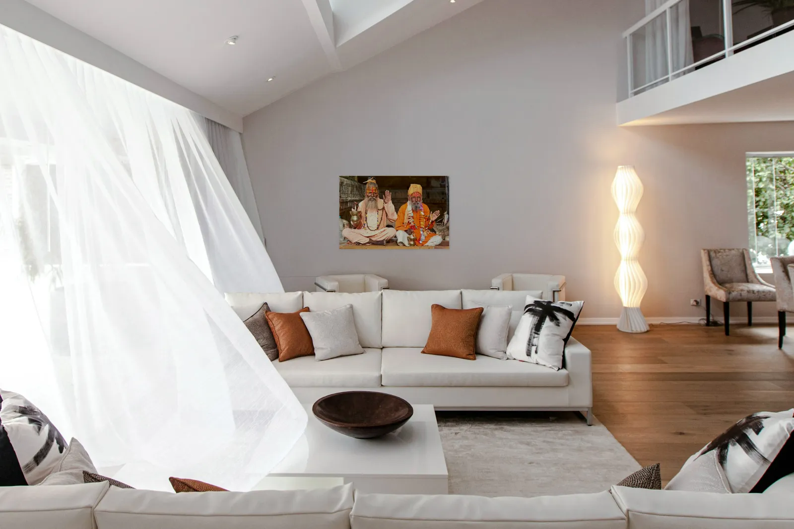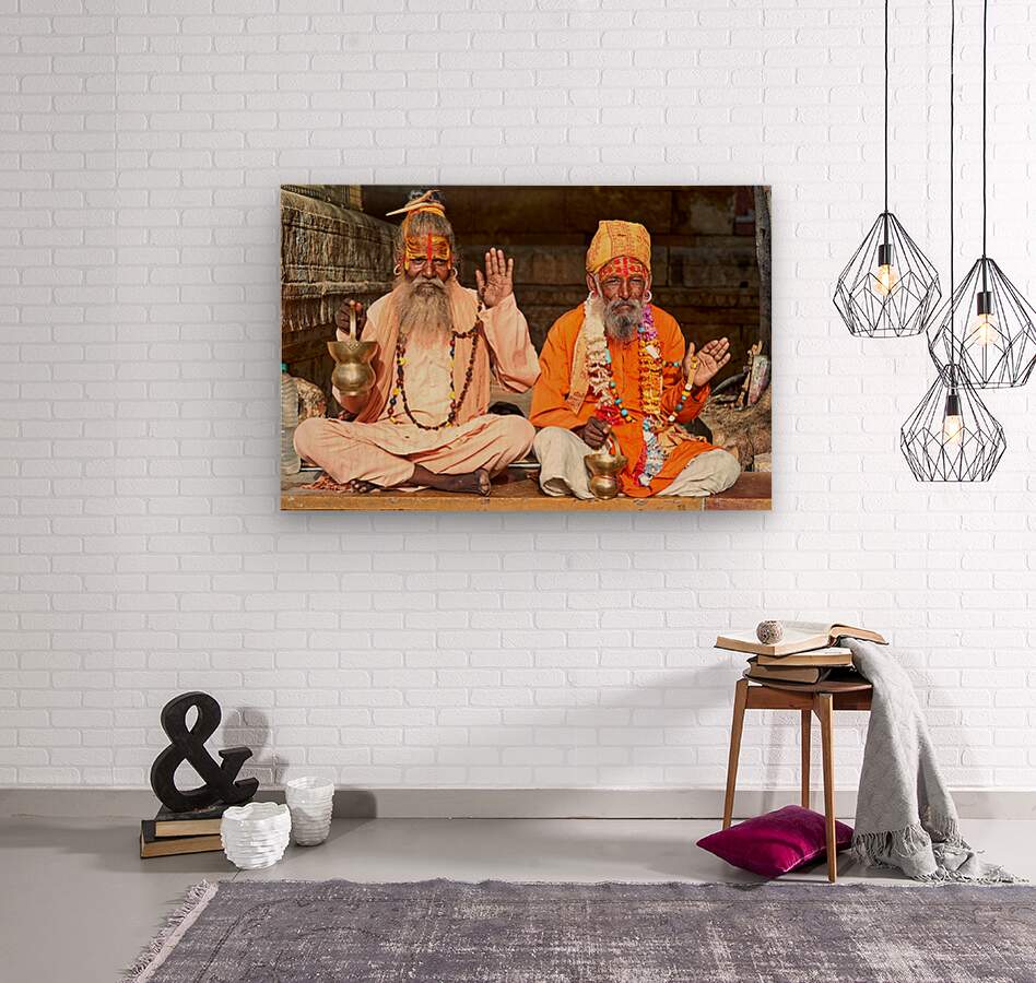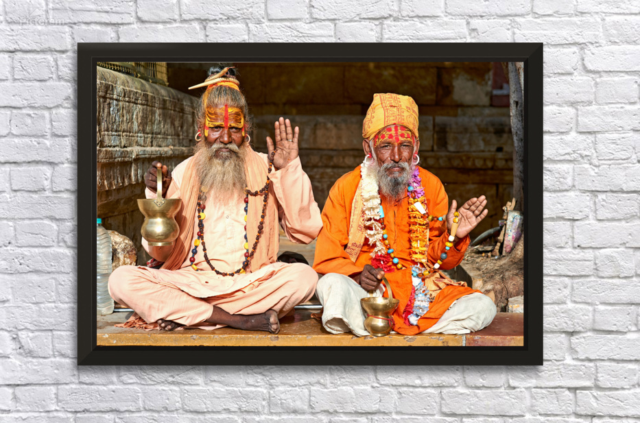 "Sadhus sitting in Jaisalmer Rajasthan during a sunny day" in a framed print.