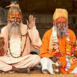 Two sadhus are sitting in Jaisalmer Rajasthan. They wear traditional clothes and hold metal pots while greeting visitors.