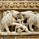 Stone carvings of elephants and warriors on the walls of Chittorgarh Fort in Rajasthan India. The details reflect old art and culture.