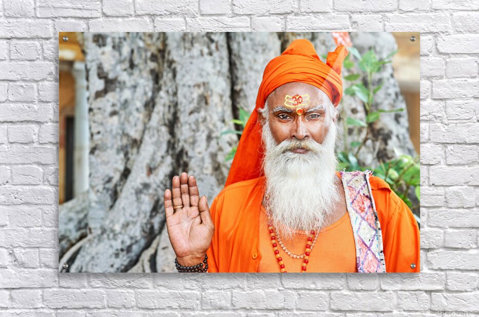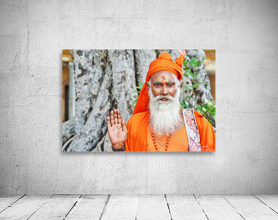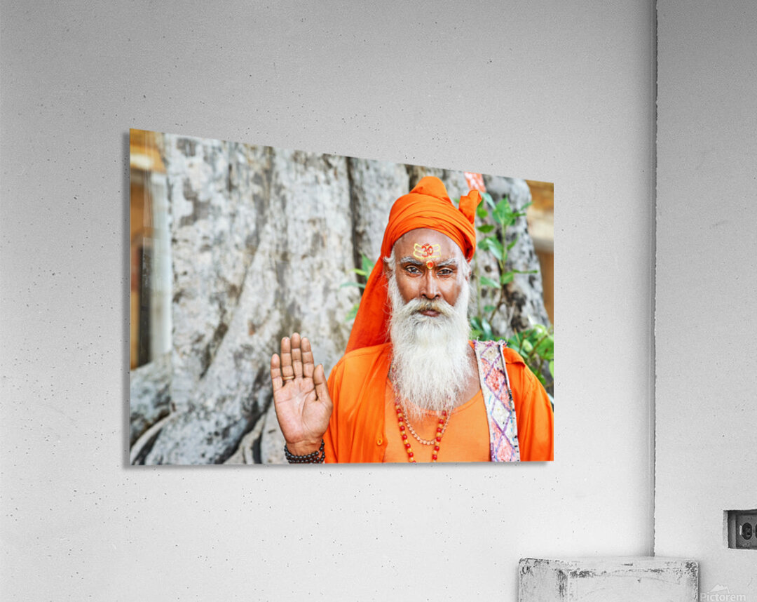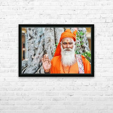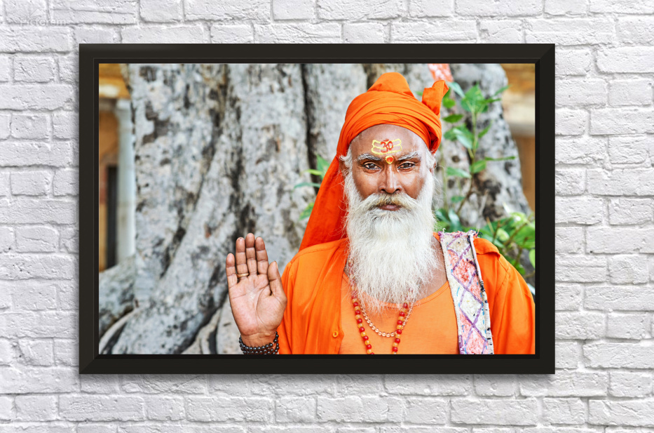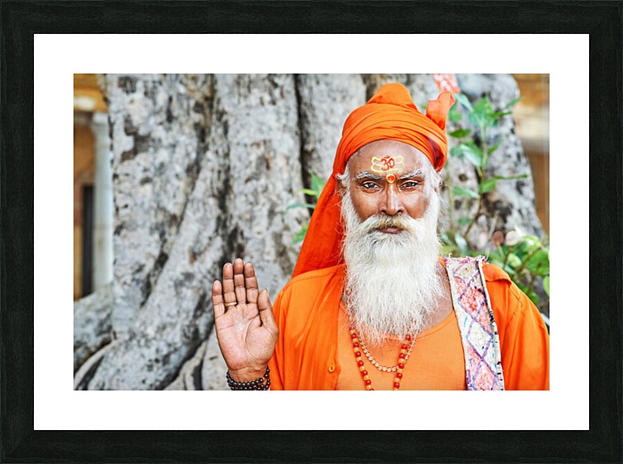 "Sadhu in orange robe stands near tree in Jaipur Rajasthan" in a framed print.