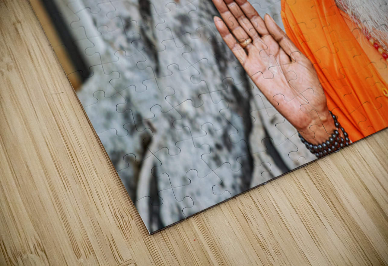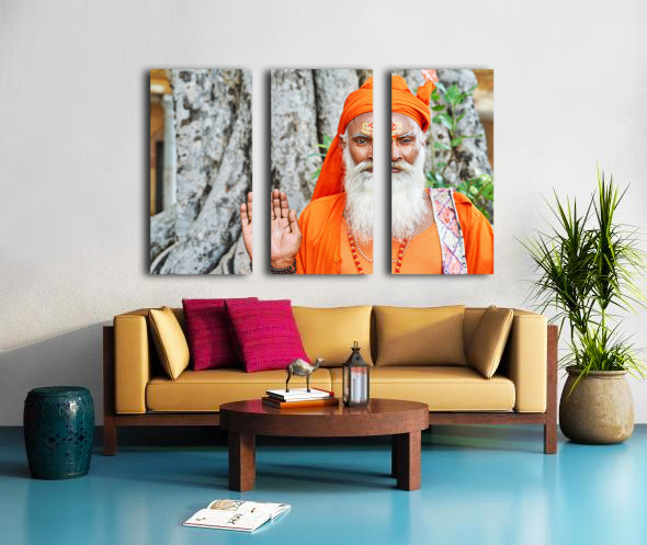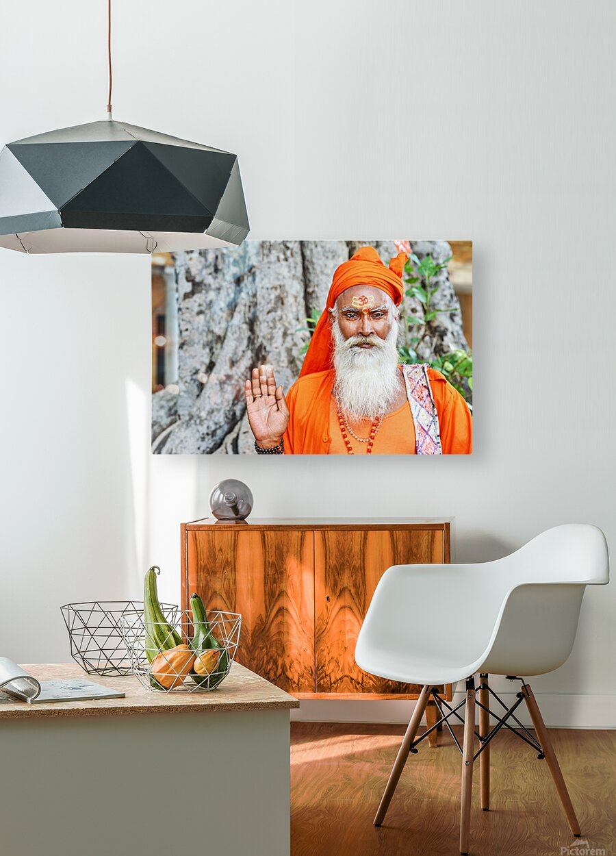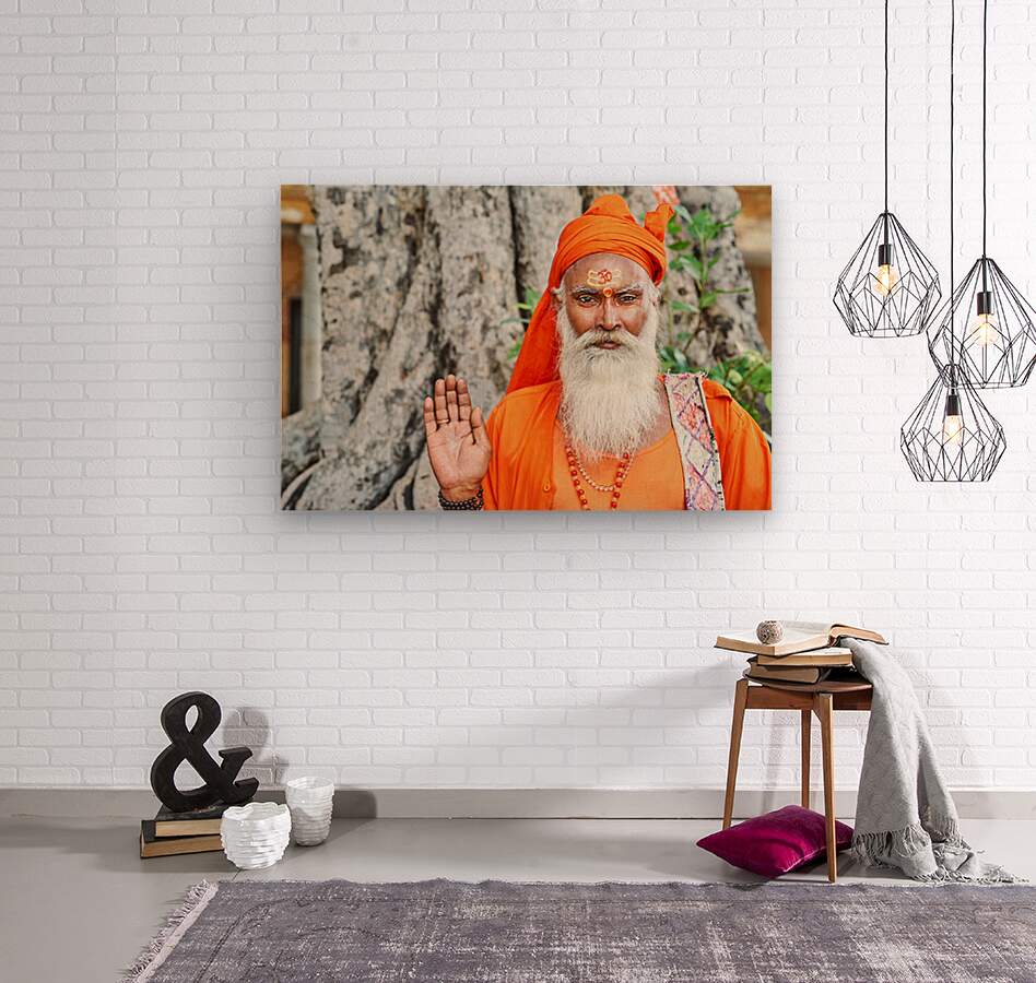 "Sadhu in orange robe stands near tree in Jaipur Rajasthan" in a framed print.