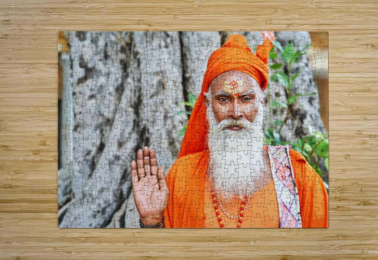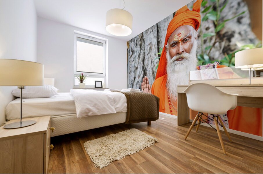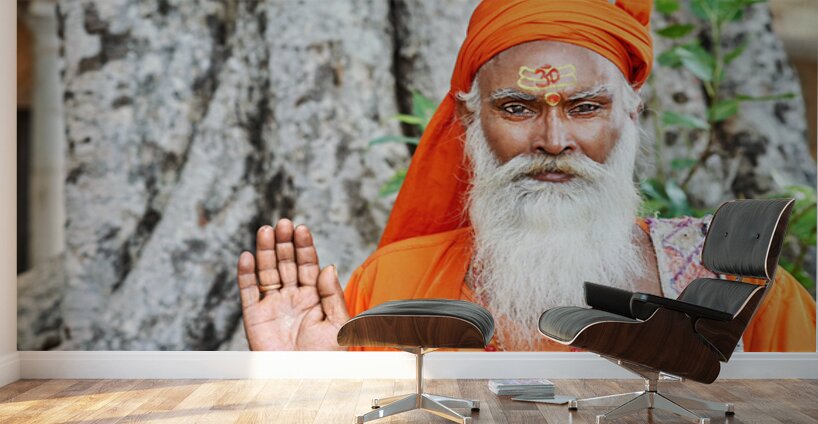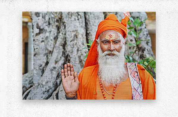 A sadhu raises his hand in greeting while standing by a large tree in Jaipur Rajasthan. The man wears an orange robe and has long hair.