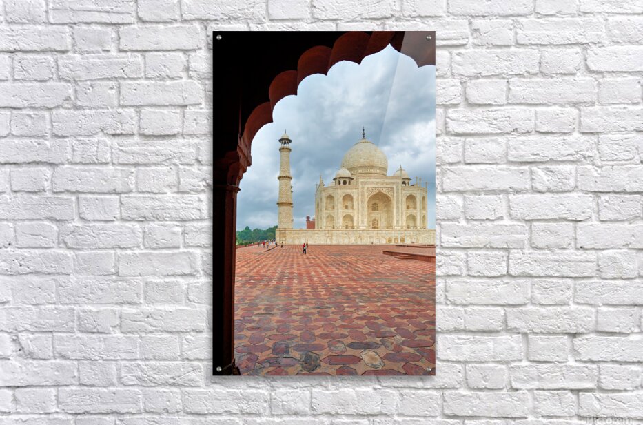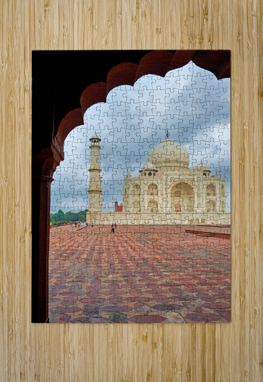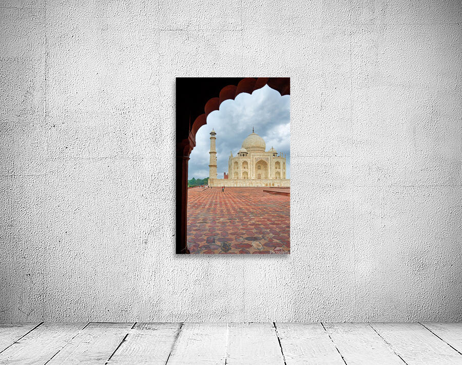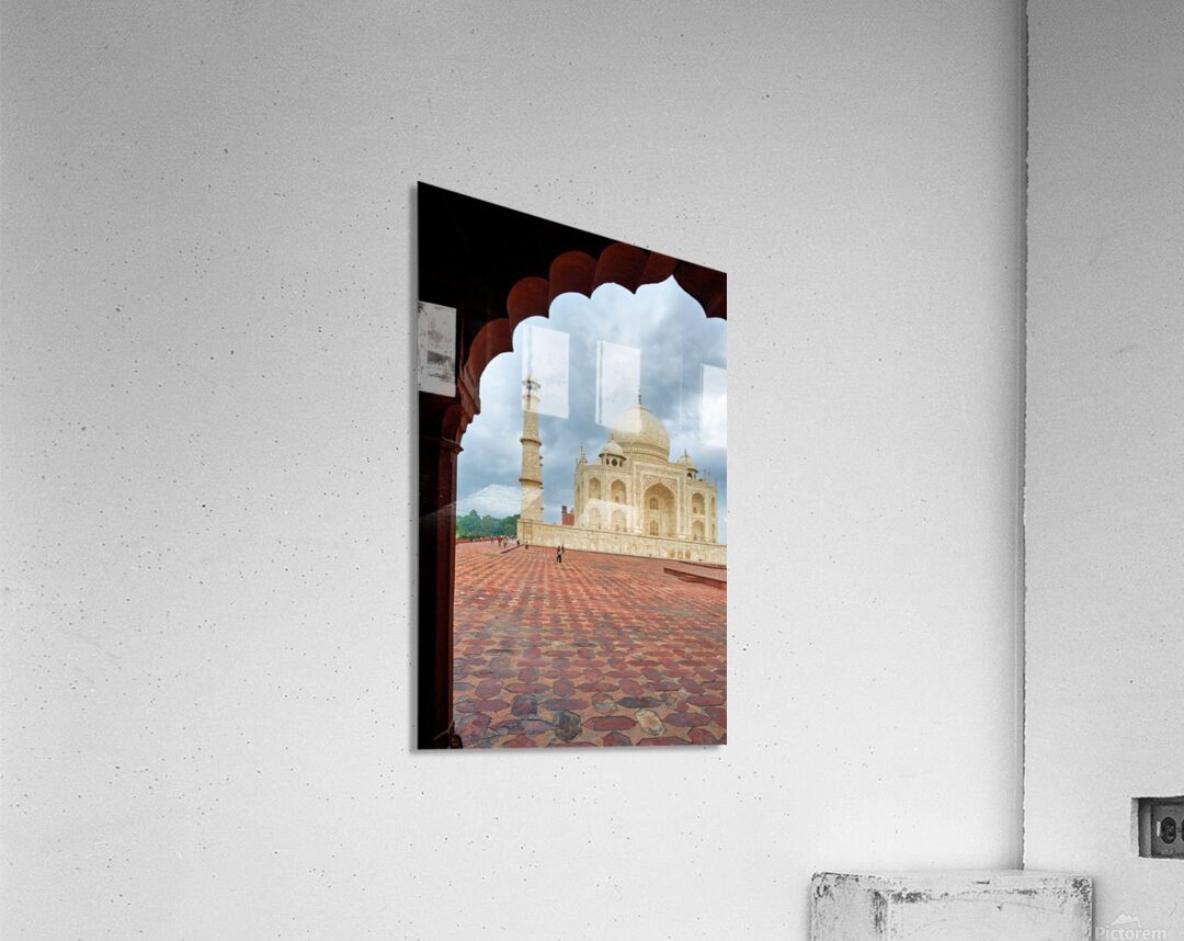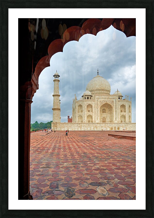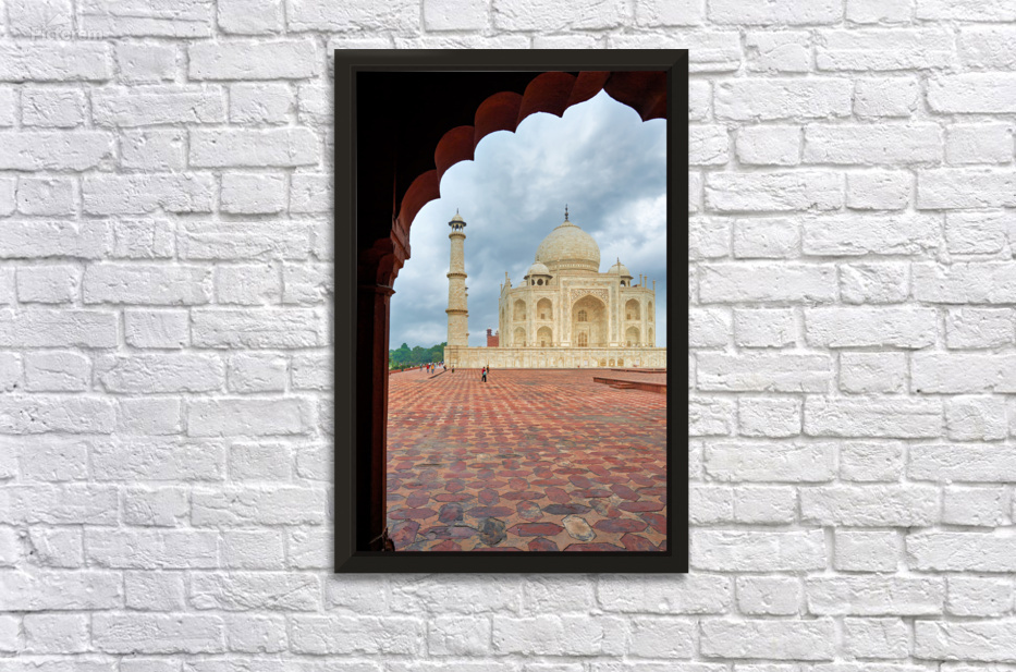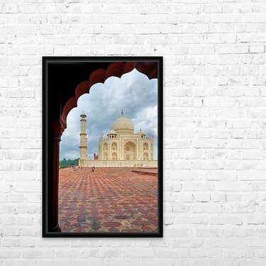 "Exploring the view of Taj Mahal from an archway in Agra" in a framed print.
