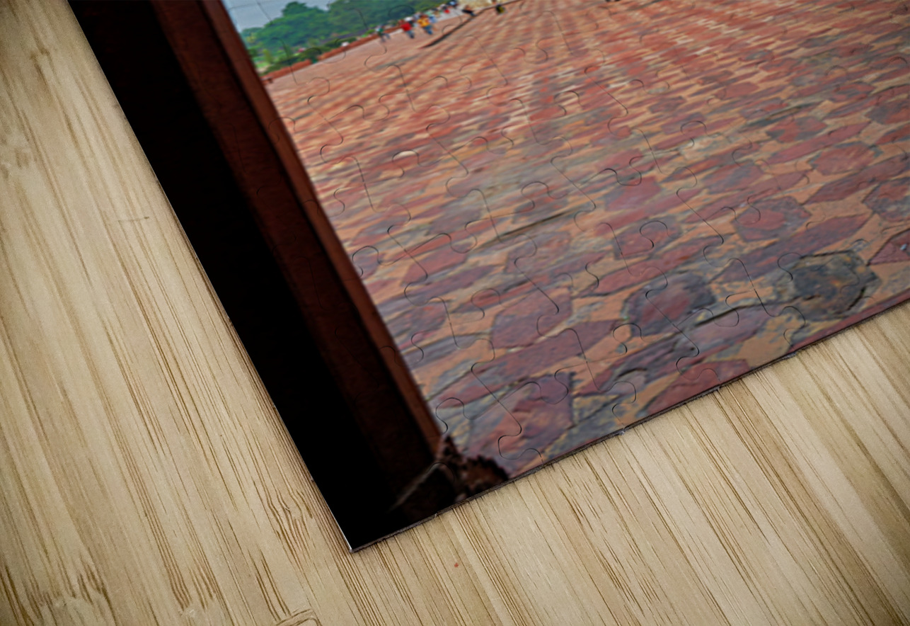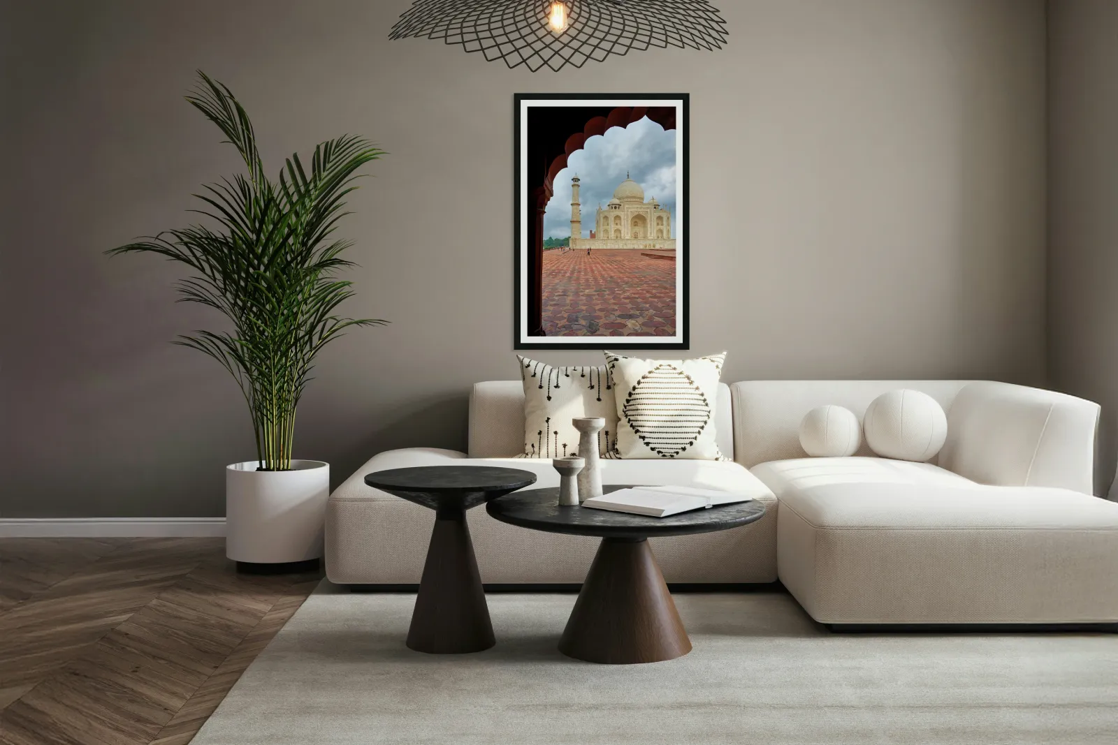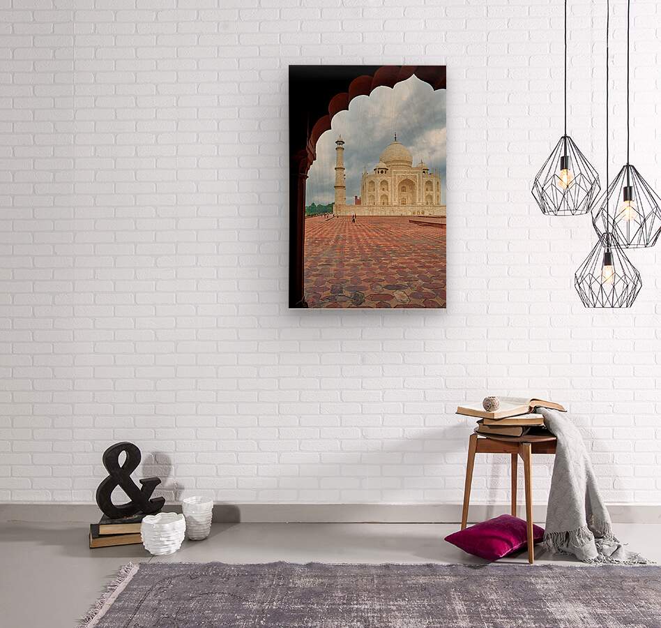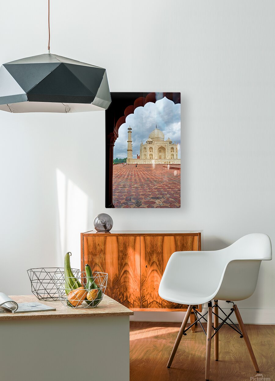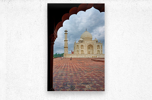 "Exploring the view of Taj Mahal from an archway in Agra" in a framed print.