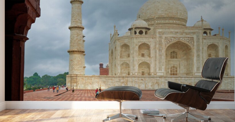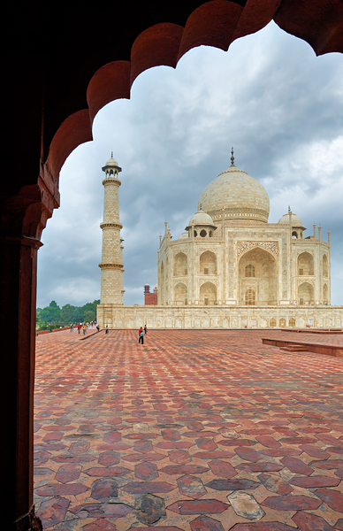 Visitors walk on the stone path near the Taj Mahal under cloudy skies in Agra India. The notable structure stands prominently in the background.