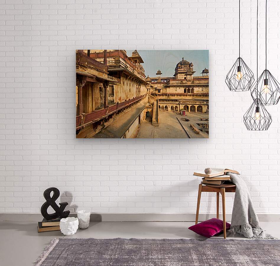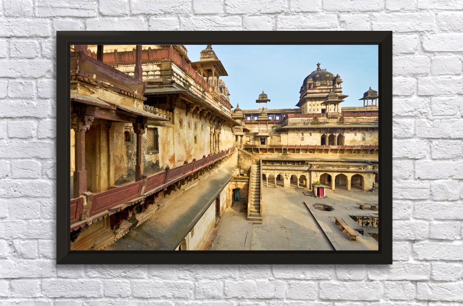 "Exploring the fort complex in orchha madhya pradesh india" in a framed print.