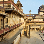 Visitors walk through the historic Fort Complex in Orchha observing the ancient walls and architecture during the daytime.