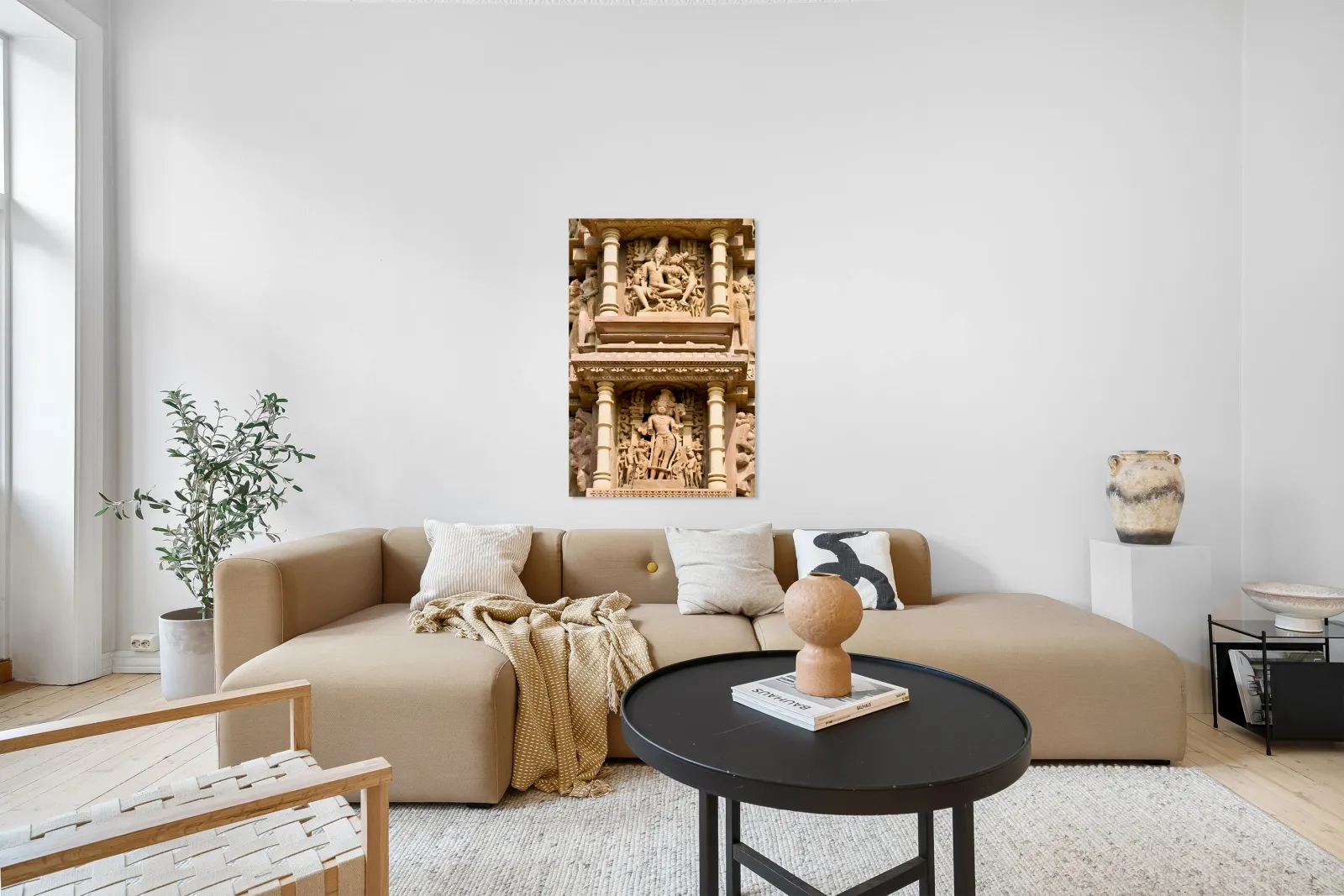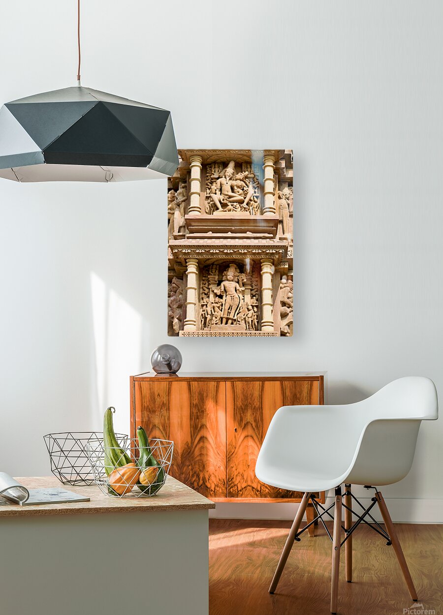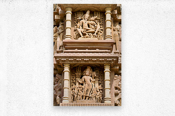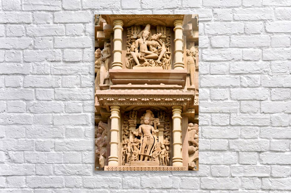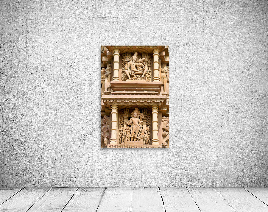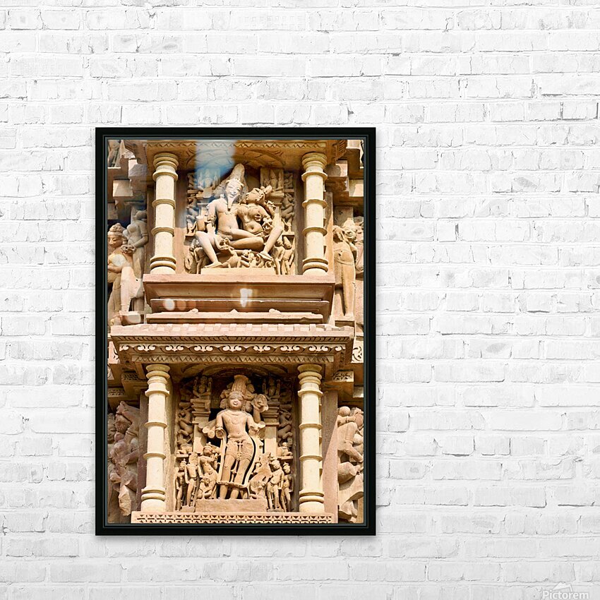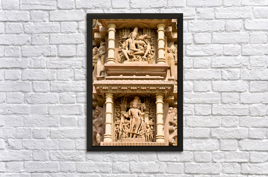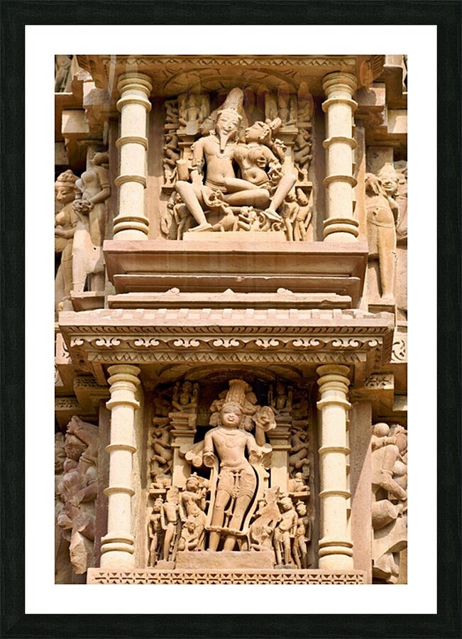 "Hindu erotic temples in Khajuraho Madhya Pradesh" in a framed print.