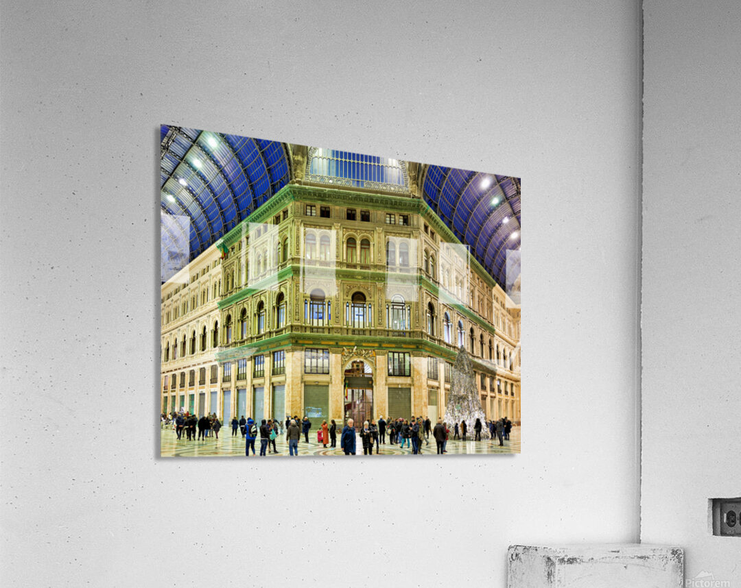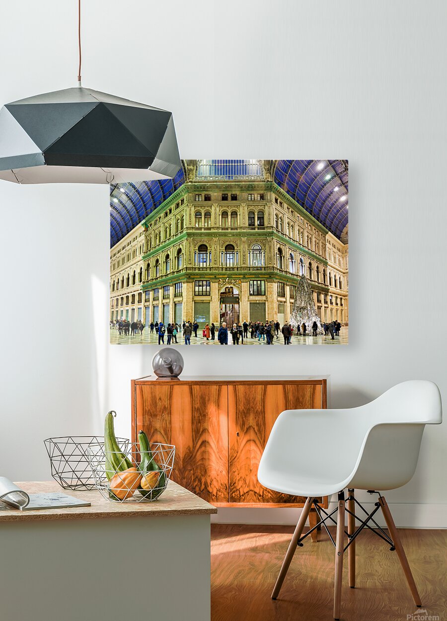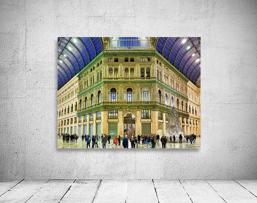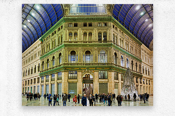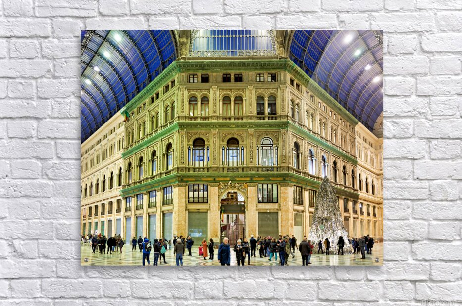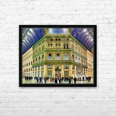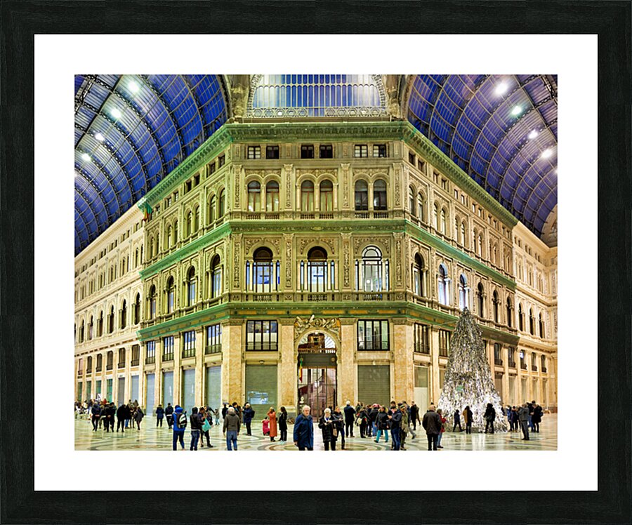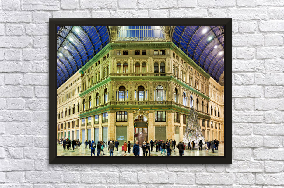 "Visitors explore Galleria Umberto I in Naples during a busy day" in a framed print.