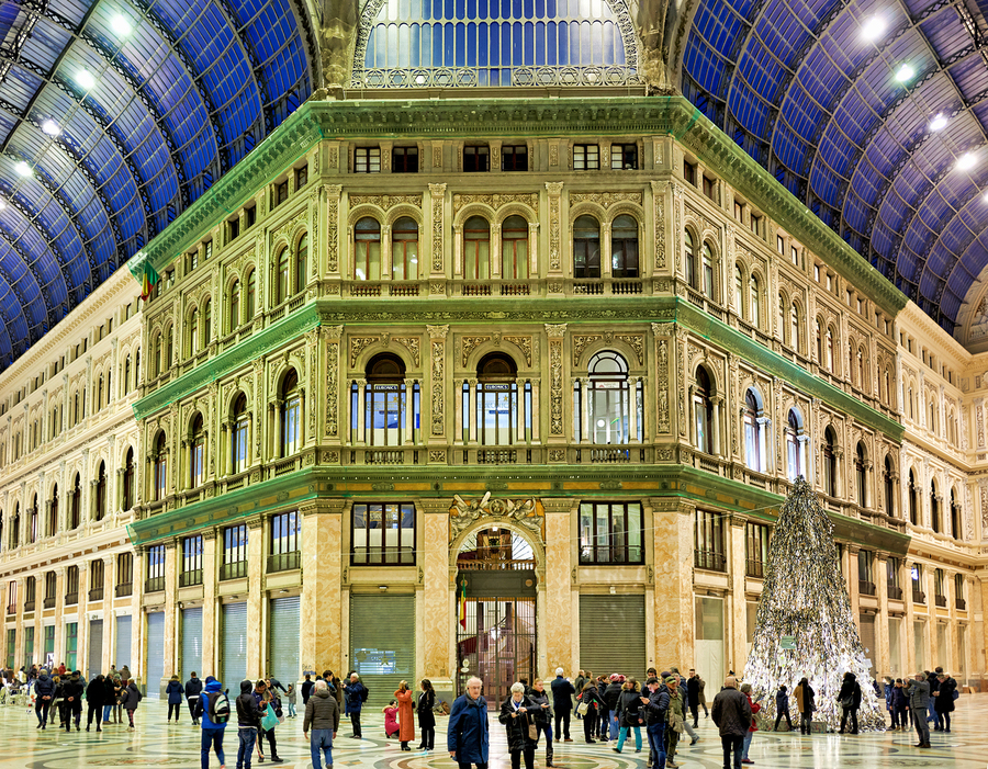 People walk through Galleria Umberto I in Naples enjoying shopping and admiring the beautiful architecture during a busy afternoon.