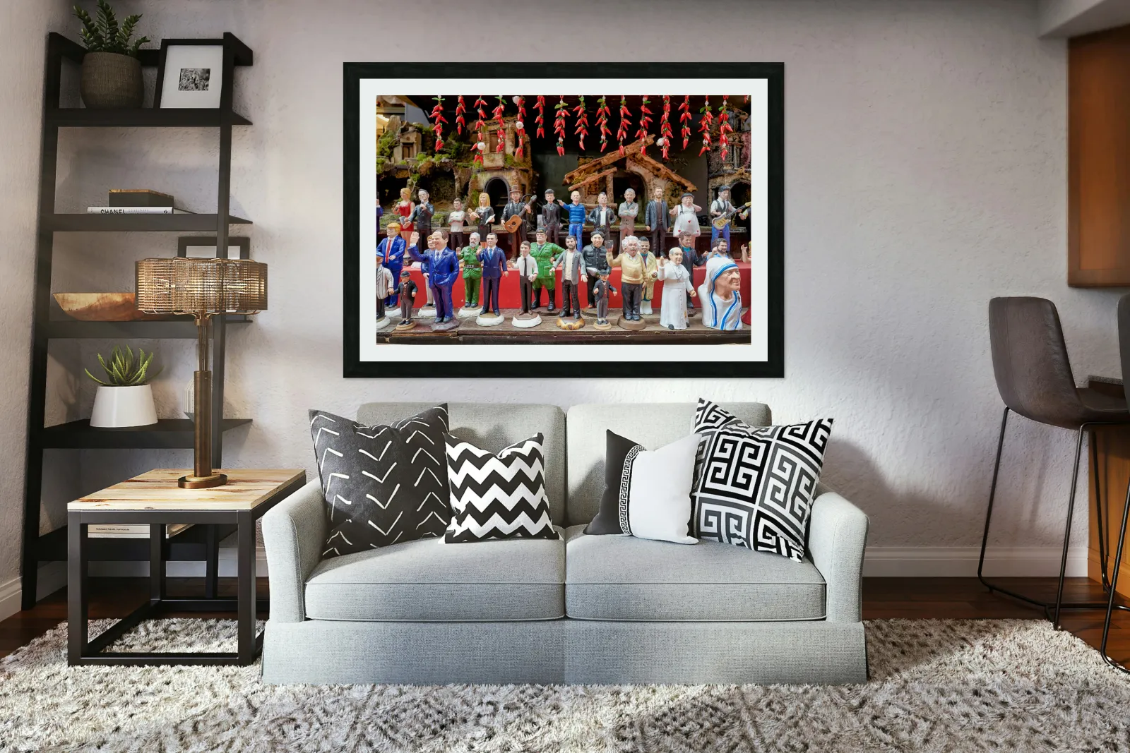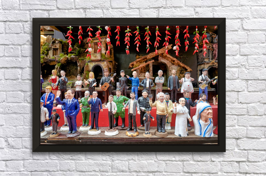 "Nativity scene statues in Naples at Christmas" in a framed print.