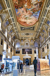Visitors admire the artwork and exhibits in the National Archaeological Museum of Naples. The museum showcases ancient artifacts and sculptures.