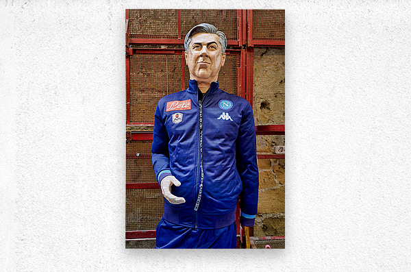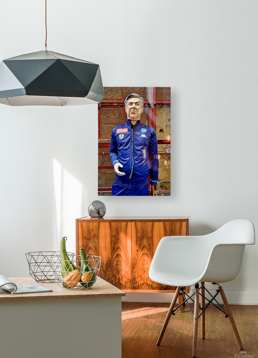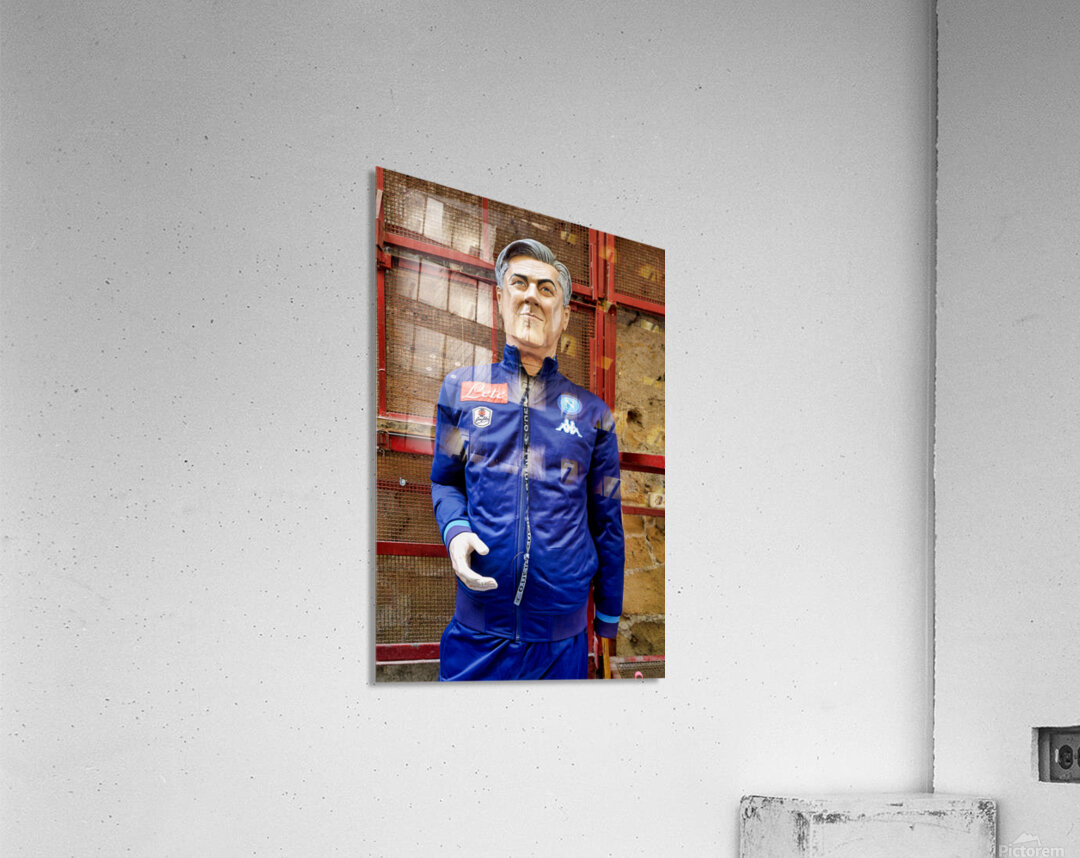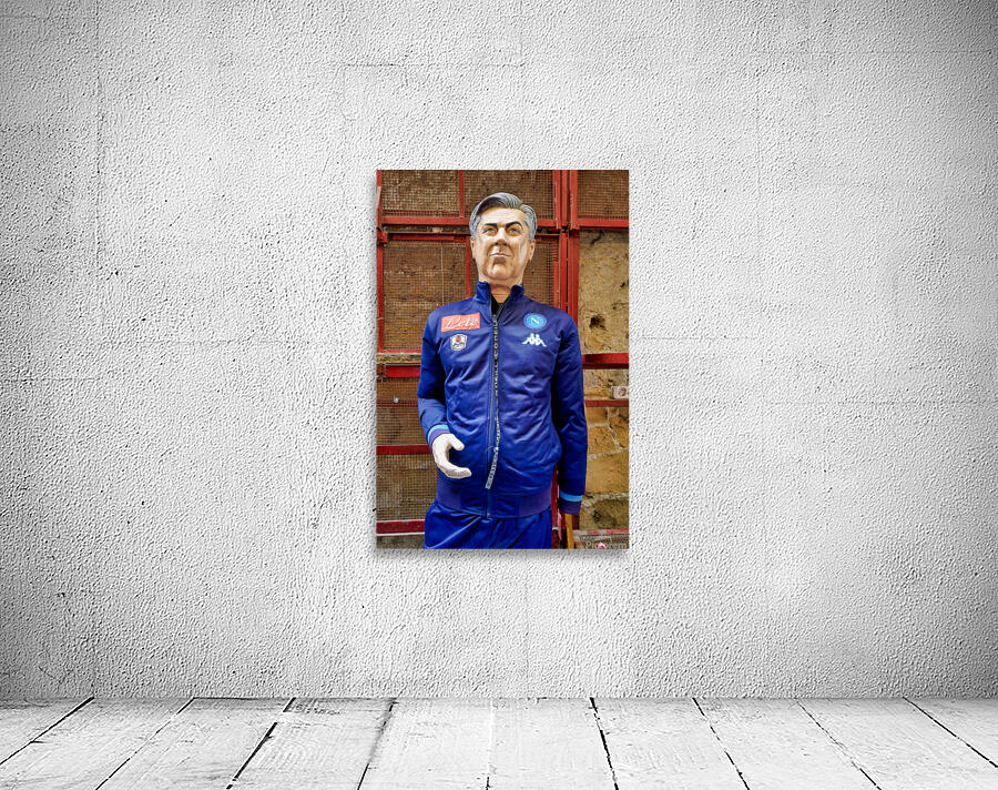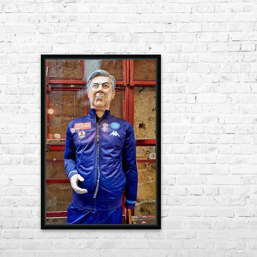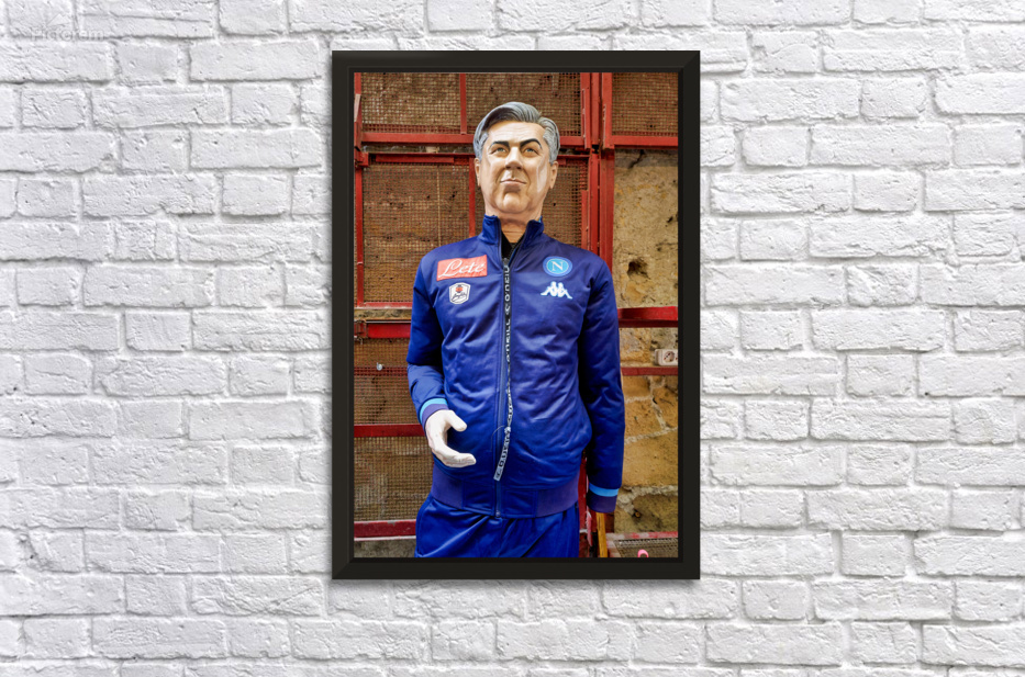 "Statues of Christmas Nativity scene in Naples artisan workshop" in a framed print.