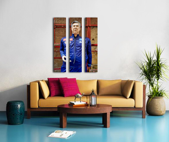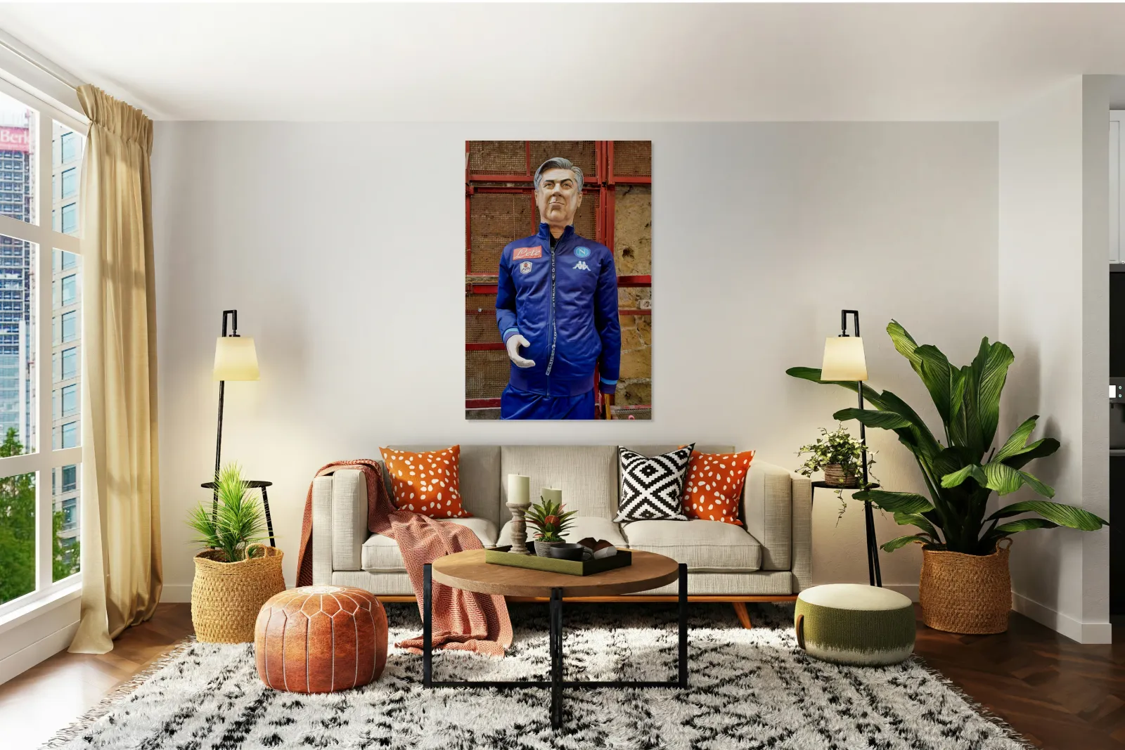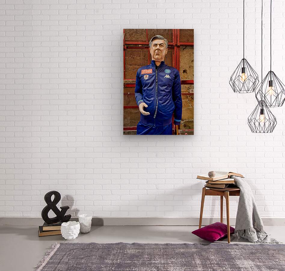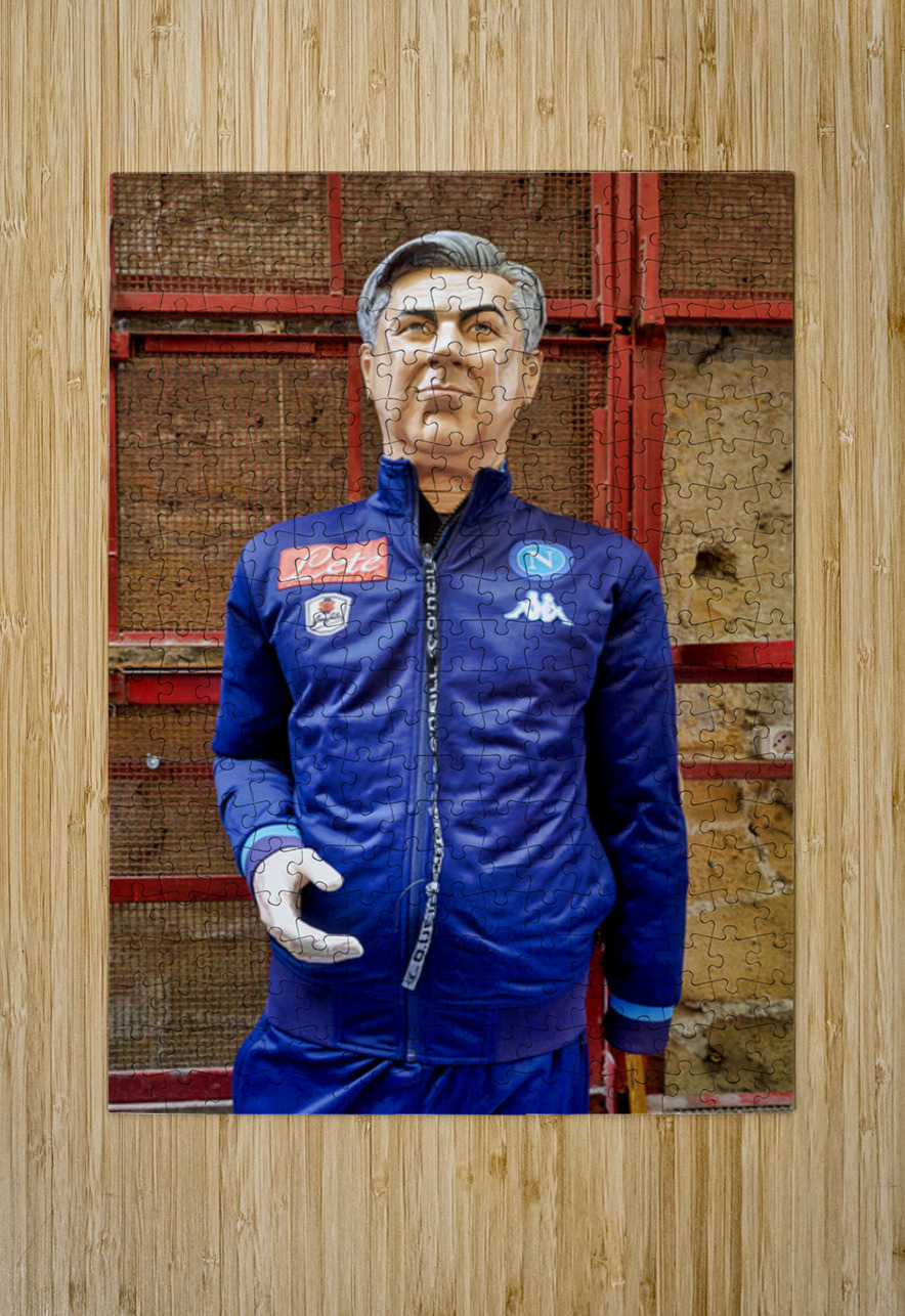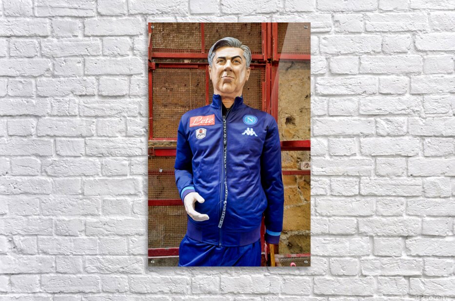 "Statues of Christmas Nativity scene in Naples artisan workshop" in a framed print.