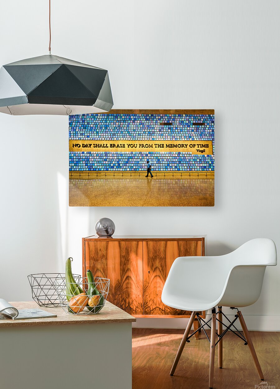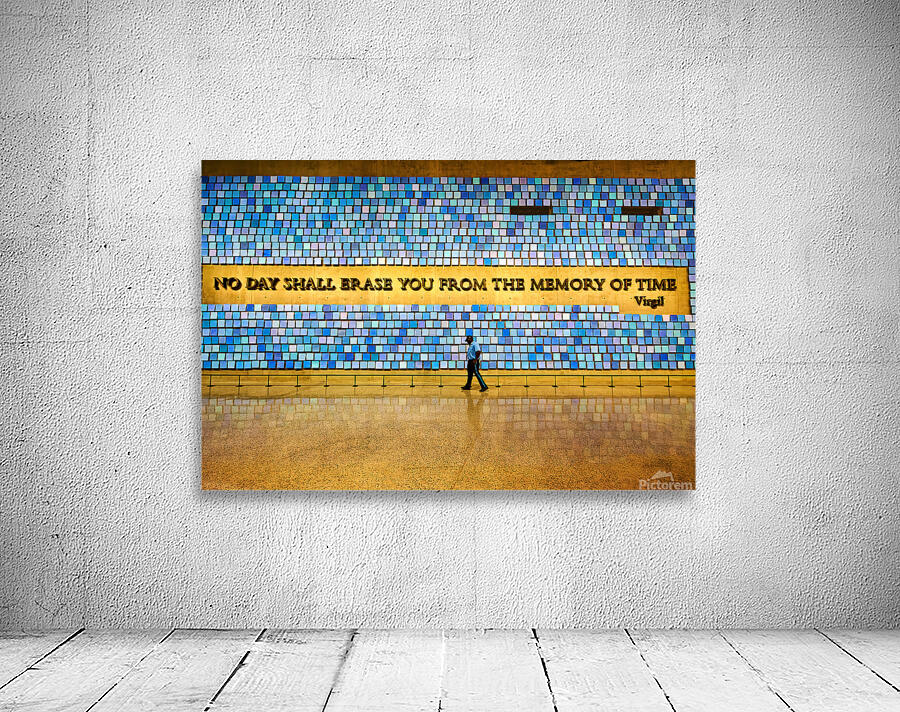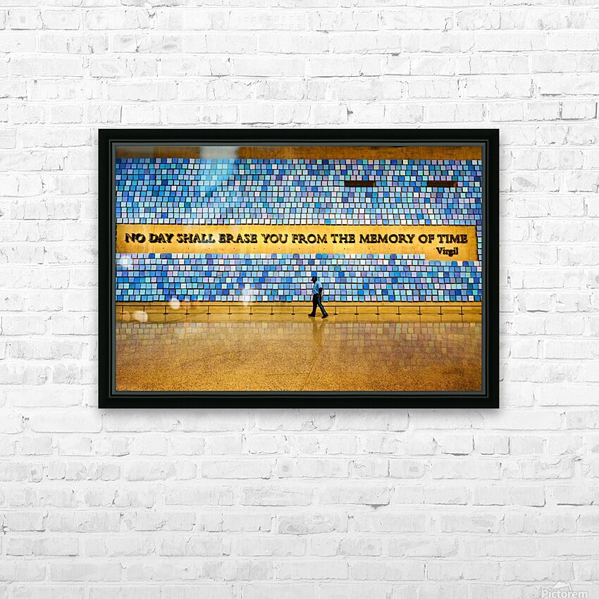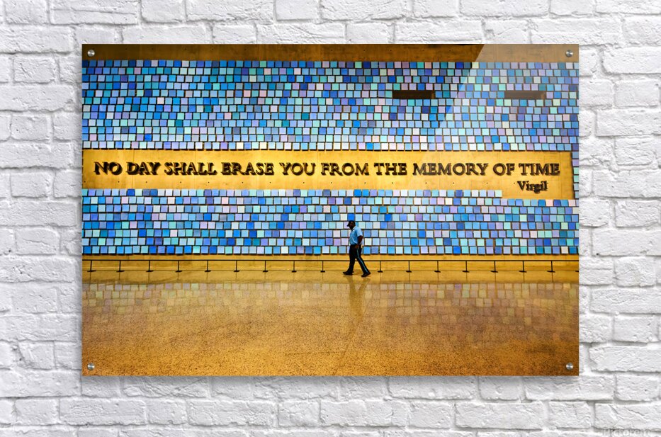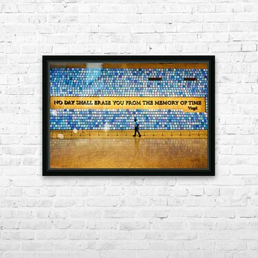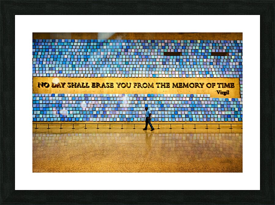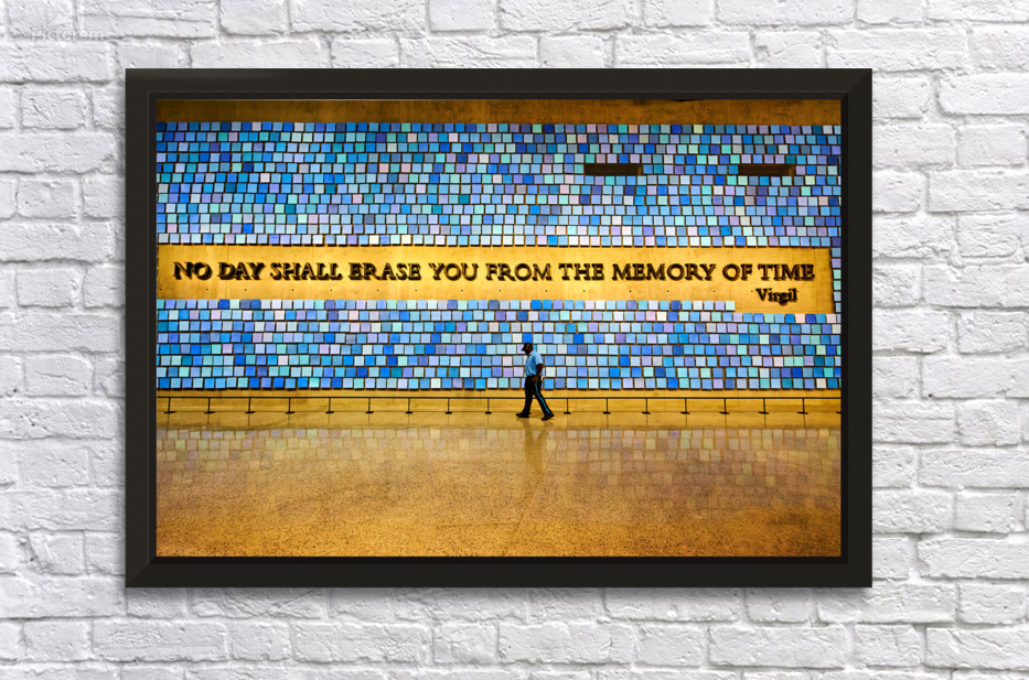 "Visitors walk by art display at National September 11 Memorial M" in a framed print.