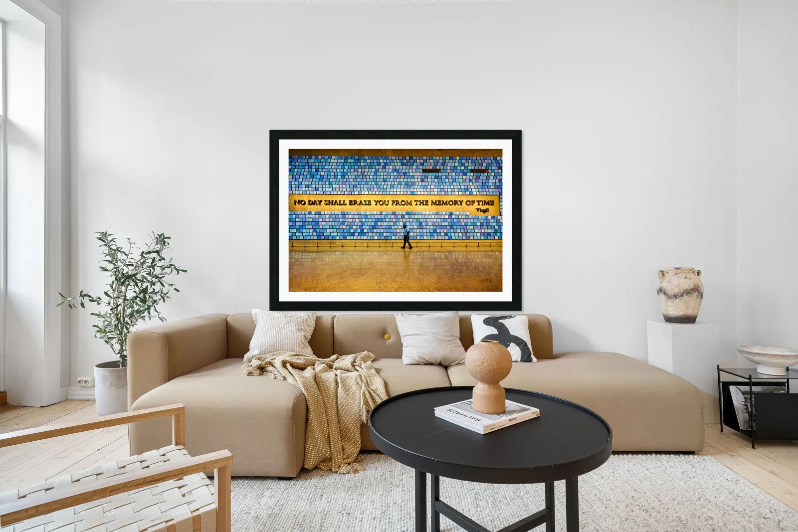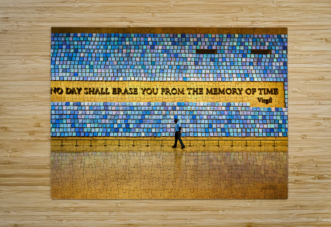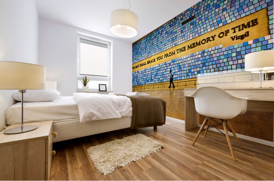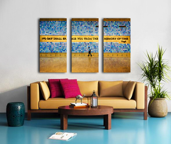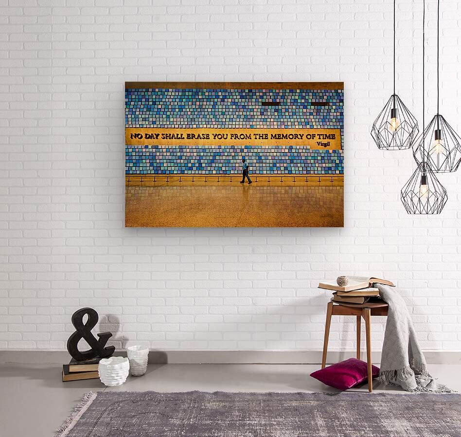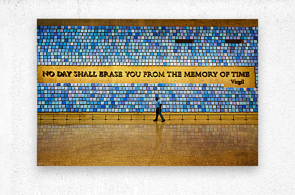 "Visitors walk by art display at National September 11 Memorial M" in a framed print.