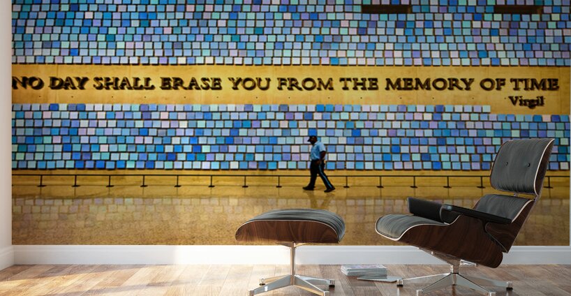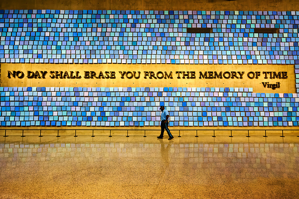 Visitors walk past a large wall with a quote at the National September 11 Memorial Museum in Manhattan. The scene captures reflection and remembrance.