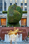 Visitors gather near the golden Prometheus statue at Rockefeller Center. The statue is surrounded by a unique garden installation.