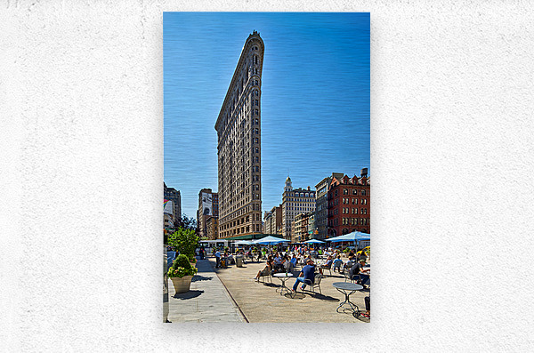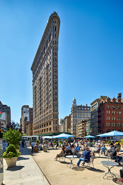 People sit at tables near the Flatiron Building in Manhattan under clear skies. The building stands tall among city streets.
