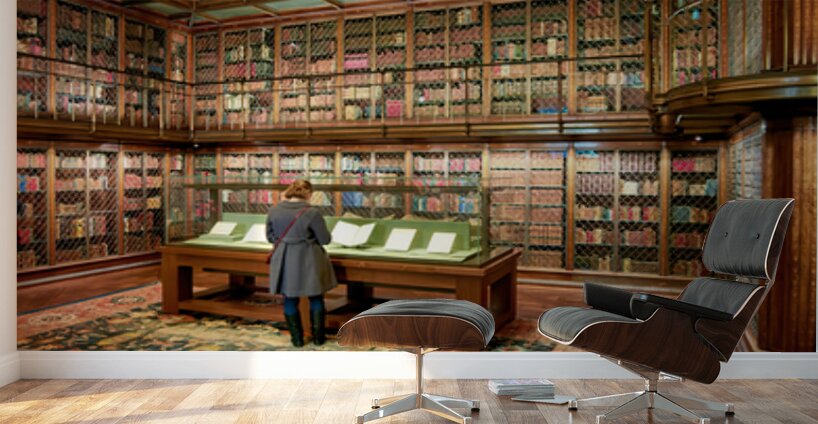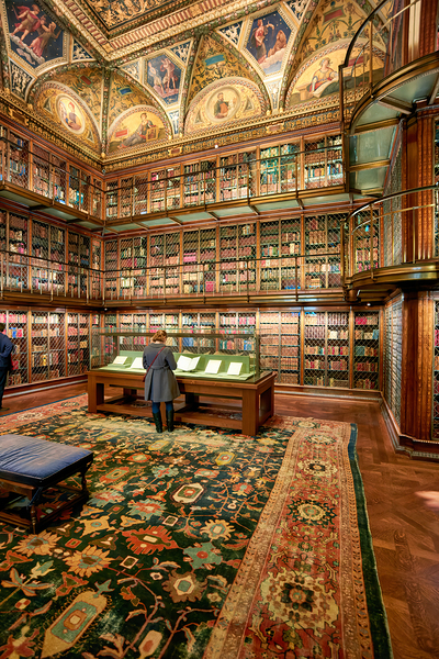 Visitors explore the Morgan Library and Museum in Manhattan surrounded by books and art. The atmosphere invites learning and appreciation.