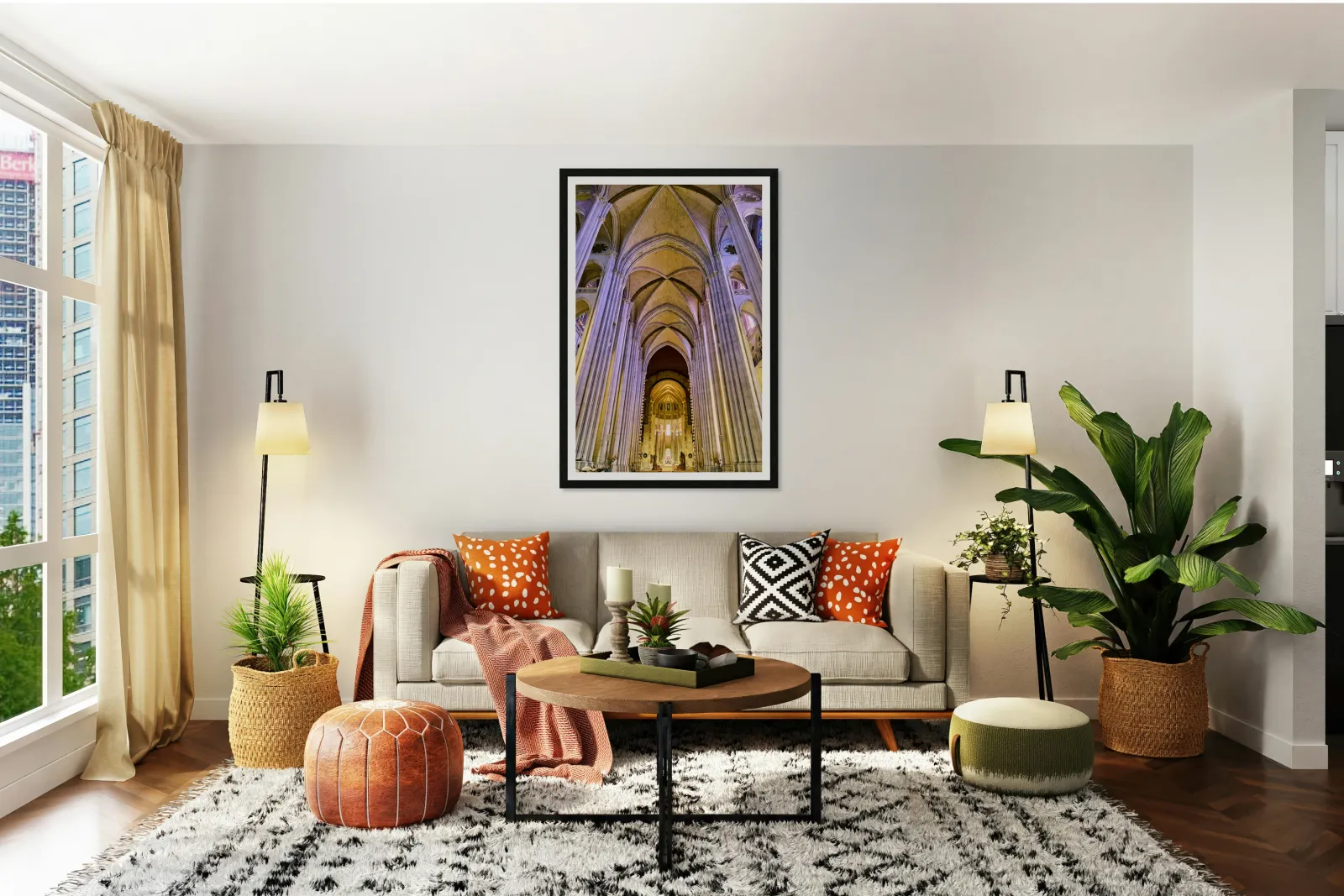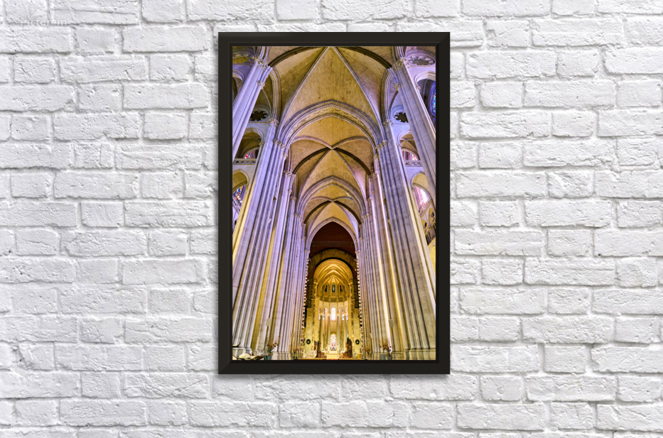 "Manhattan cathedral interior showing arches and altar area" in a framed print.