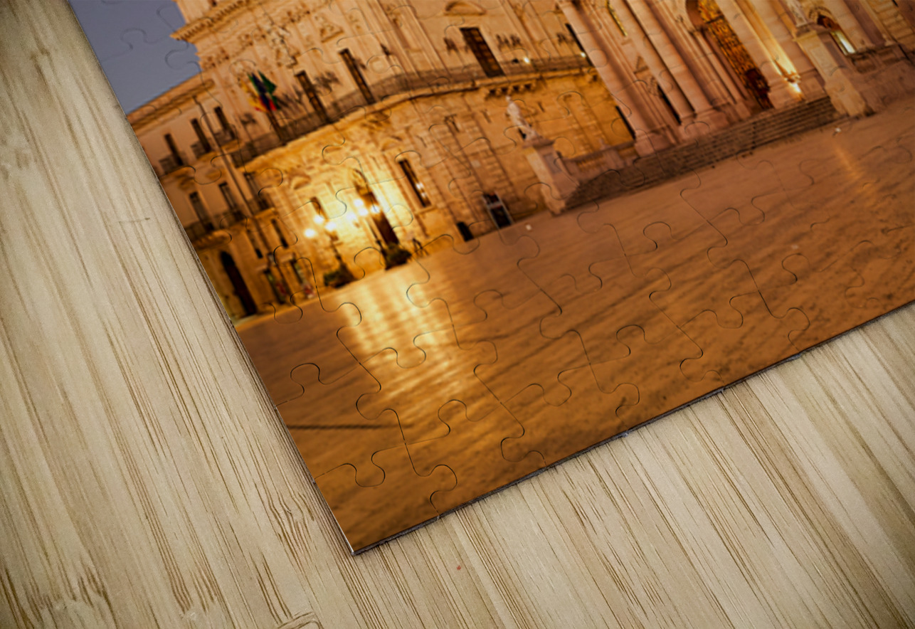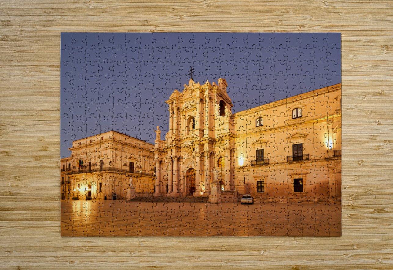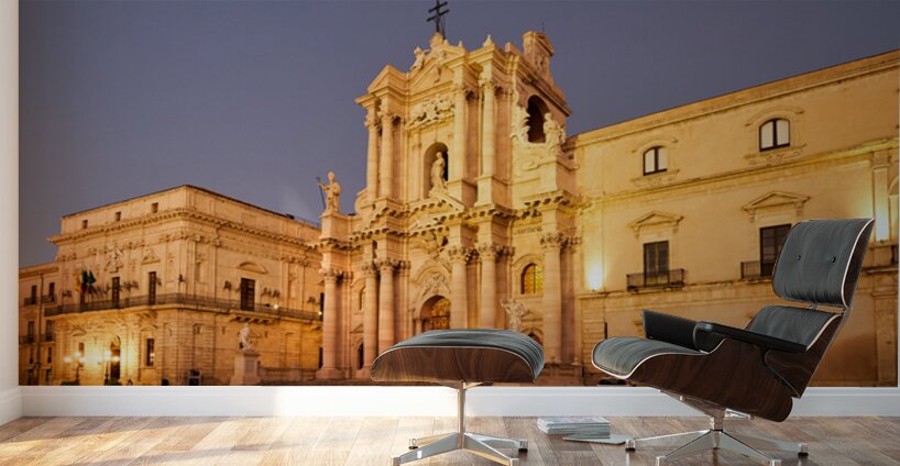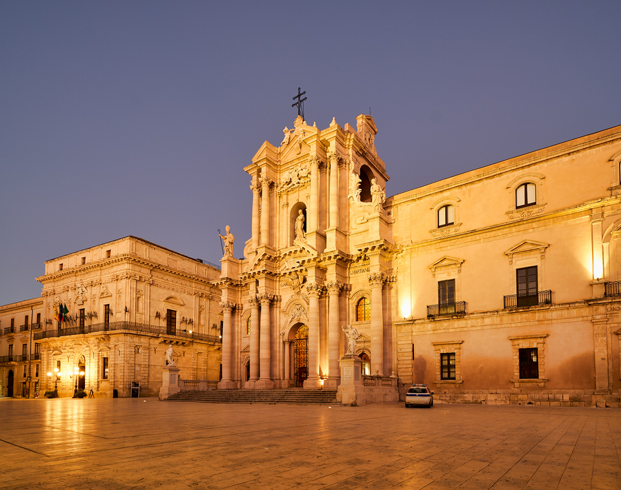 The view shows Syracuse Cathedral located in Ortygia Island Sicily at dusk. The building stands tall with lights illuminating its facade.