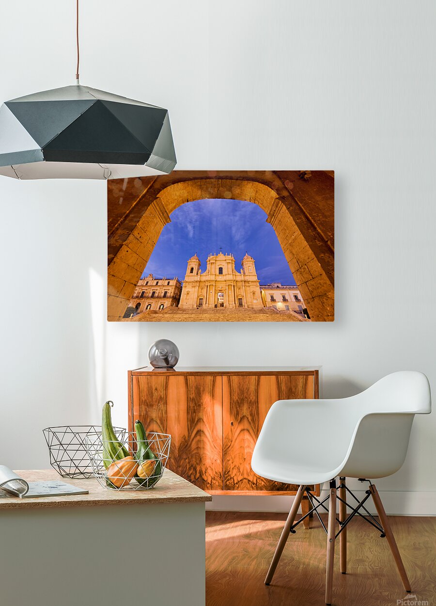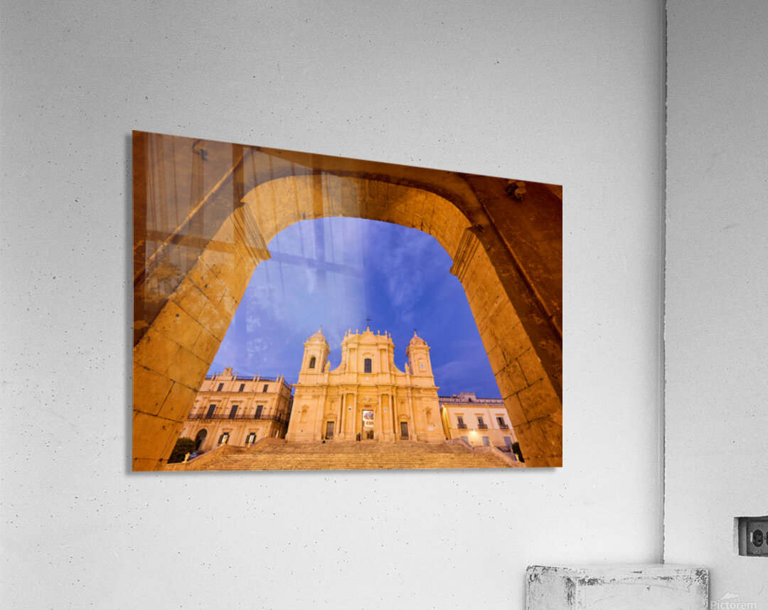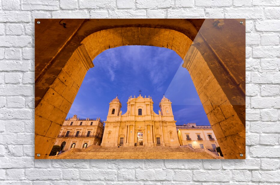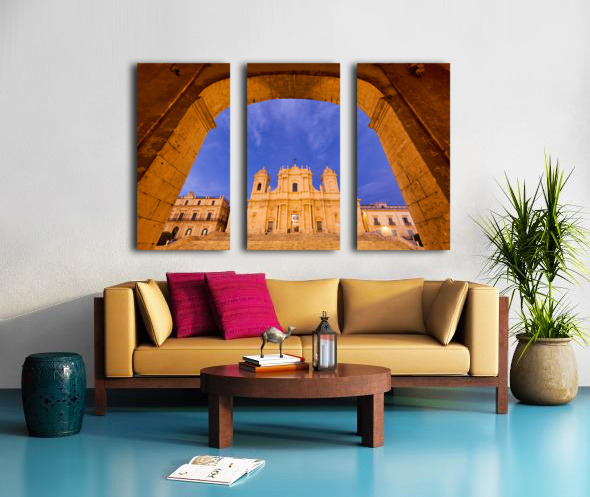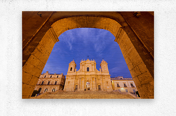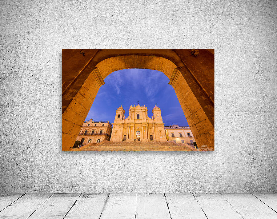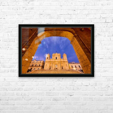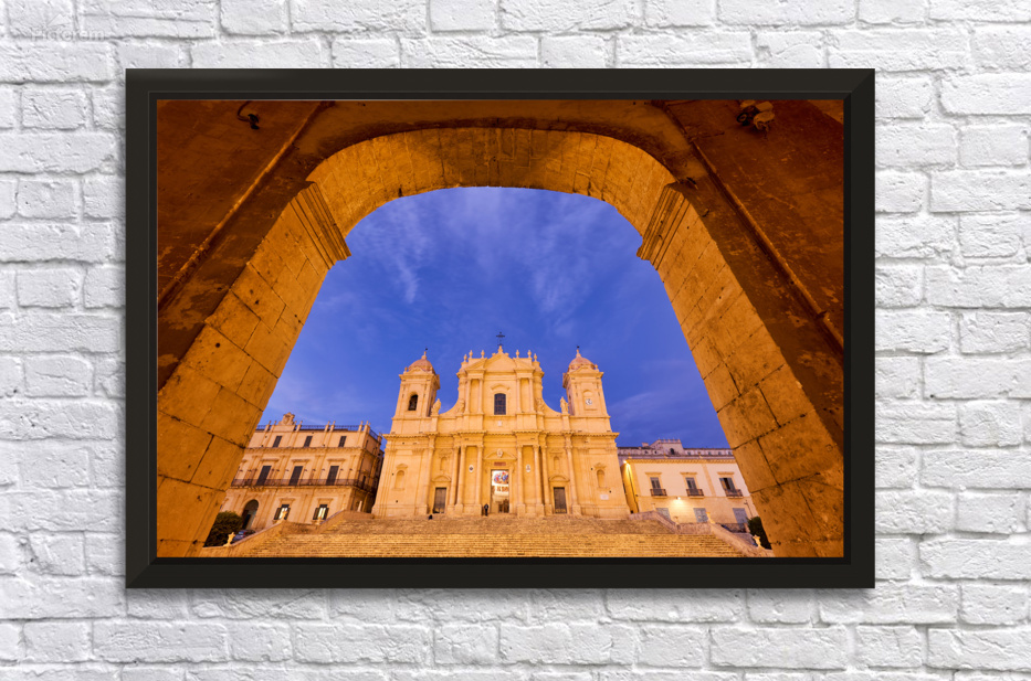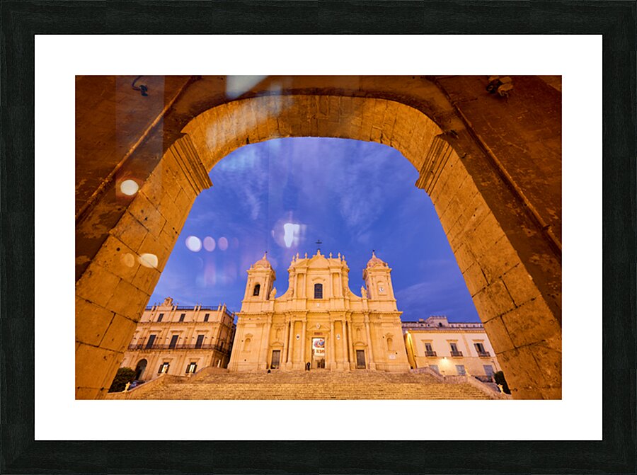 "Noto Cathedral in Sicily at dusk under a colorful sky" in a framed print.