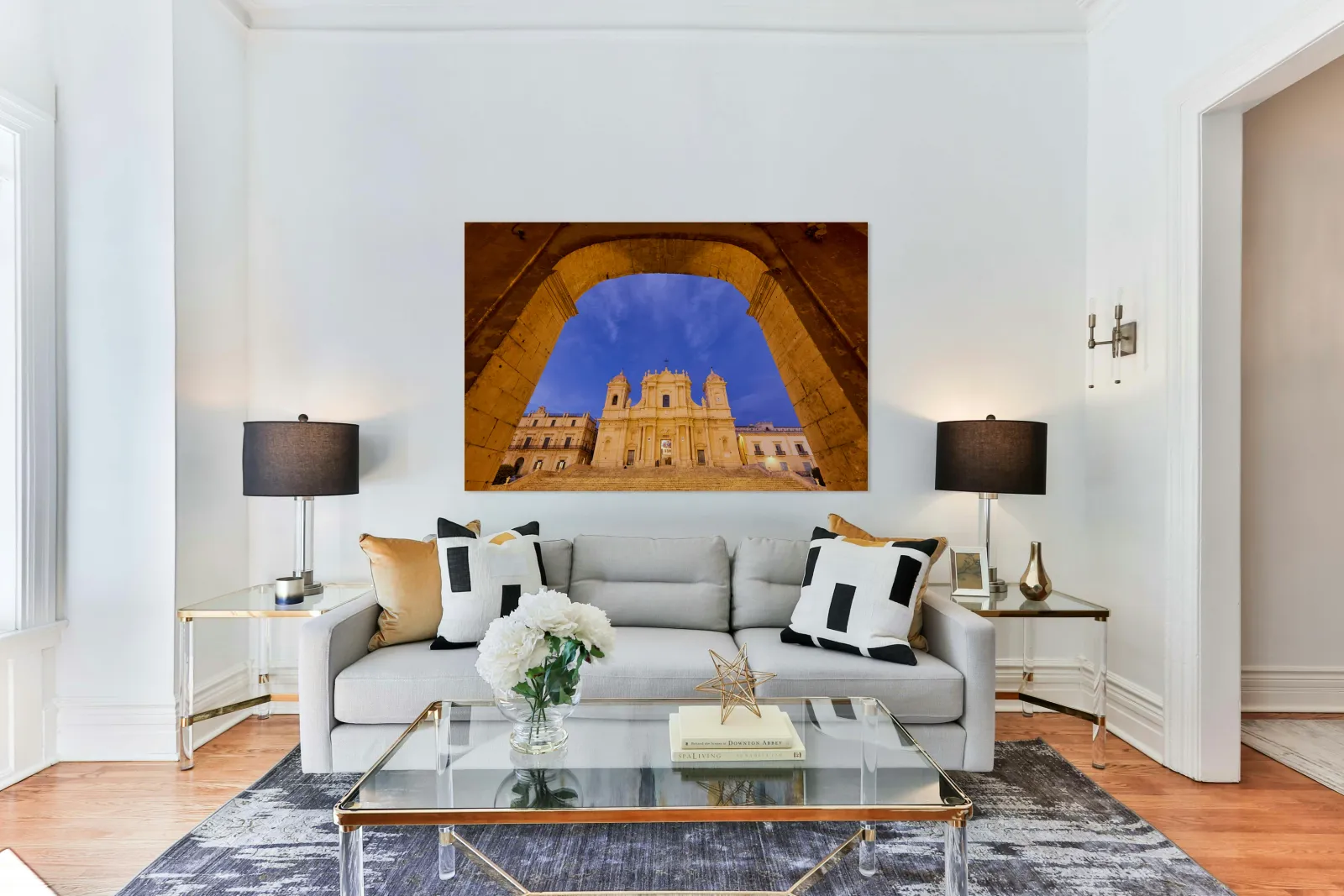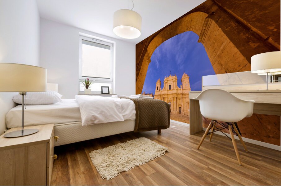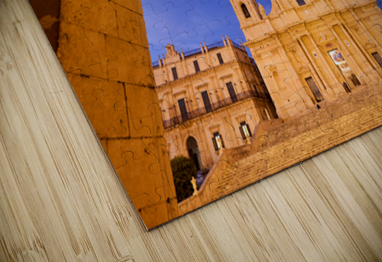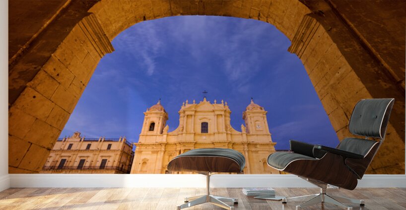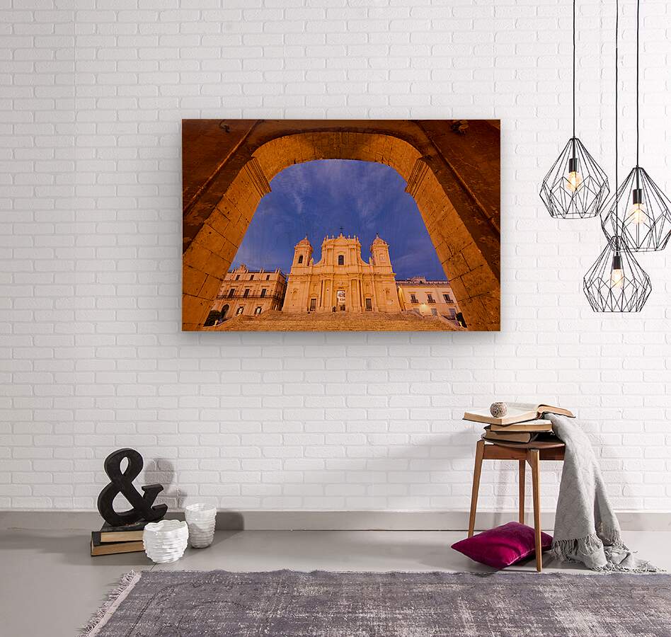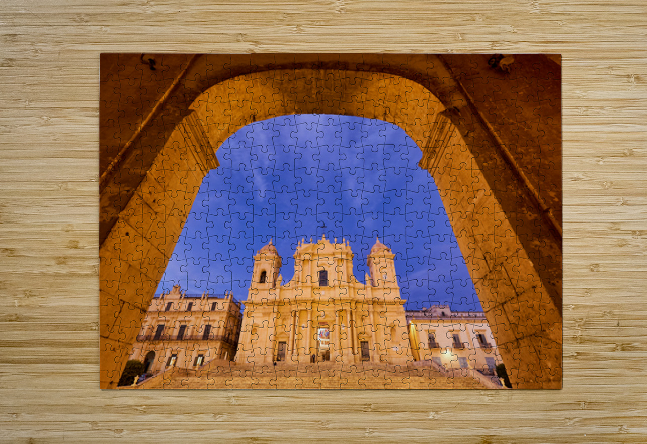"Noto Cathedral in Sicily at dusk under a colorful sky" in a framed print.