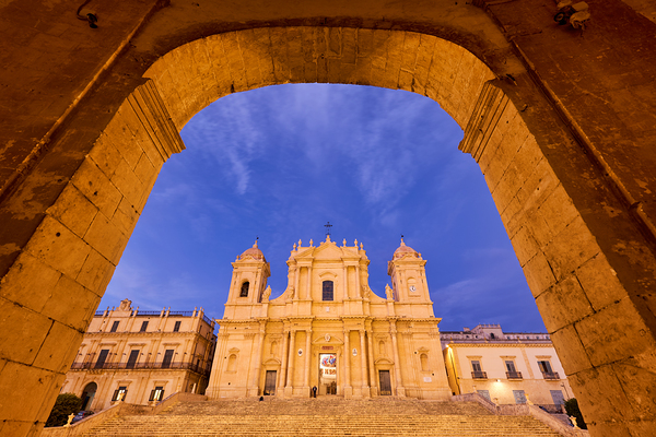 Noto Cathedral stands tall in Sicily during dusk. Visitors admire the building as the sky changes colors.